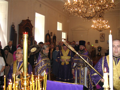 Andrei Sommer leads the moleben before the reliquary of the saints.