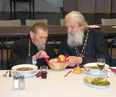 Photo: His Eminence Metropolitan Laurus with Protopriest George Bielay at a trapeza during the pastoral retreat of the Canadian Diocese in Toronto.