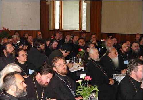 Настоятель Покровского храма, протоиерей Георгий Ларин, выступил с приветственным словом и призвал духовенство не надеется на свой разум, а на соборный разум Церкви. Отец Георгий напомнил участникам совещания, что будут в нас узнавать учеников Христовых по той любви, которую мы имеем между собой. Доклад архиепископа Берлинского и Германского Марка был посвящен теме путей Русской Православной Церкви заграницей в прошлом и будущем. Владыка Марк затронул ряд вопросов: преемственность церковной власти в России, отношения митрополитов Анастасия и святителя Иоанна к официальной Церкви в России, экклезиология св. новомученика Кирилла Казанского и возможность сближения двух частей Русской Церкви. В заключение архиепископ Марк поставил вопрос о желательности нашей Церкви быть участницей в процессе оздоровления церковной жизни в России и прочитал молитву святым страстотерпцам Борису и Глебу. За докладом архиепископа Марка последовал круглый стол на тему положения Русской Зарубежной Церкви в наши дни. Епископ Сан-Францисский и Западно-Американский Кирилл поделился впечатлениями своей первой поездки в Россию. Он несколько раз повторил, что патриарх Алексей при встрече с делегацией Русской Зарубежной Церкви подчеркнул, что не может быть и вопроса о каком-либо общении пока все вопросы, разделяющие две части Русской Церкви, не будут разрешены. Епископ Гавриил говорил о духовном попечении людей из России, а также о том, что старшему поколению наших прихожан трудно примириться с мыслью о возможном соединении с Церковью в России. Епископ Кливлендский Петр высказал личную мысль, что сергианство не догма, а скорее образ поведения. Протопресвитер Валерий Лукьянов (США) изложил славный и часто тернистый путь Зарубежной Церкви и говорил, что единомыслие с Церковью в России может быть достигнуто только всенародным покаянием в России и зарубежьи и только на основе чистоты православия. Прот. Николай Артемов (Германия) рассказал о приходской жизни в Баварии и о значении двух прошедших церковно-исторических конференций в Венгрии (2001) и Москве (2002). Священник Ярослав Беликов поделился своими мыслями о том, куда может привести путь церковной изоляции, а также о том, что наша главная задача – окормления нашей паствы. Архимандрит Тихон (Шевкунов), наместник Сретенского монастыря в Москве, посвятил свой доклад теме взаимоотношений двух частей Русской Церкви. Некоторые высказывания сегодняшнего дня причинили ему боль, но во многих он почувствовал искренность. Отец Тихон сказал о том, что у обеих частей Русской Церкви обоюдная ответственность: не погрешить против правды. Он поблагодарил Русскую Зарубежную Церковь за все, что она сделала для России и православия и подчеркнул, что Зарубежная Церковь может России предложить опыт существования в плюралистическом обществе, а Церковь в России зарубежью – крайний опыт существования в безбожном обществе. Далее о. Тихон прочитал постановления Архиерейского Собора (Московского Патриархата) о взаимоотношении Церкви с властями, а также интервью 1991 года патриарха Алексея, где речь идет об отказе в сергианстве. В заключение о. Тихон огласил письмо патриарха Алексея предстоящему Архиерейскому Собору Русской Православной Церкви заграницей. Круглый стол на тему «Современное положение Церкви в России»