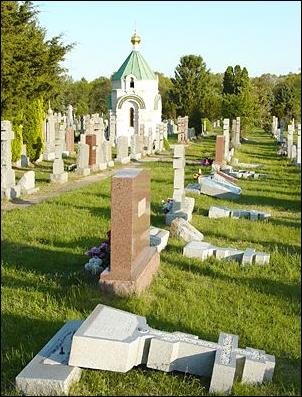 Осквернено Свято-Владимирское кладбище Во вторник 13 мая вандалы осквернили Свято-Владимирское русское православное кладбище в Джаксоне, штате Нью-Джерси (США). Было опрокинуто и поломано более 70 крестов и памятников в казачьем отделе кладбища. Пострадала и кладбищенская часовня, выстроенная в память выдачи казаков в Лиенце. Окна часовни были разбиты брошенными в них камнями, лампадами и вазой от цветов. У входа в часовню находились бронзовые фонари из Германии – они также были повреждены. Ручка от двери была поломана и брошена на землю. Пасхальные яйца, положенные верующими на могилы родных в день Радоницы, были брошены об стенку часовни и скорлупа везде валялись на земле. Возмещение убытка выразится в сумме около 70,000 ам. долларов.