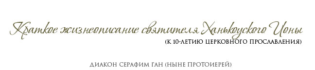 «Простите меня ради Христа, да не забывайте в своих святых молитвах. Напишите в помянничек...» – завещал приснопамятный Преосвященнейший Иона, епископ Ханькоуский, стяжавший своей сугубо-аскетической жизнью, богатейшим духовным опытом и активным служением ближнему общую к себе любовь и почитание, «подвигом добрым подвизахся» (2 Тим. 4, 7). Дерзая писать об одной из звезд на небосклоне Русской Православной Церкви и русского рассеяния, начинаю сие повествование словами известного архипастыря и выдающегося миссионера архиепископа Камчатского и Петропавловского Нестора (Анисимова; + 1962 г.):
