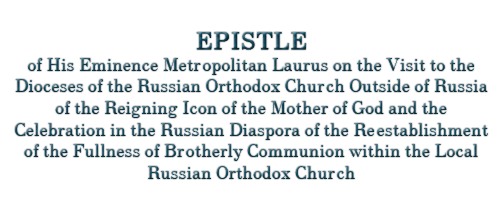 The forthcoming church celebrations in our dioceses marking the restoration of the fullness of brotherly communion within the one Russian Orthodox Church, are for us, Her servants, a joyous opportunity to increase our efforts to make the grace-filled Gifts of the Resurrected and Ascended Lord be received with worthiness. That is why, in preparing ourselves to these celebrations, we must turn our minds and hearts to our perpetual task of strengthening friendship and cooperation within our Church. This means that we must strive to love one another, we must live in peace, we must with all our souls praise the Lord, Who, becoming man, showed us the example of love, humility and longsuffering, in order to edify us with His life.