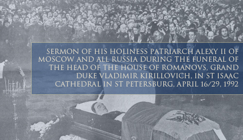 Sermon of His Holiness Patriarch Alexy II of Moscow and All Russia during the funeral of the Head of the House of Romanovs, Grand Duke Vladimir Kirillovich, in St Isaac Cathedral in St Petersburg, April 16/29, 1992