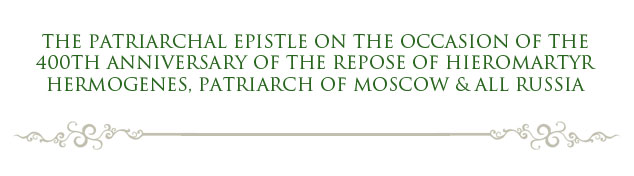 His Holiness, Patriarch Kyrill of Moscow & All Russia has addressed the following epistle to the faithful on the occasion of the celebration of the 400th anniversary of the day on which Hieromartyr Hermogegnes, Patriarch of Moscow & All Russia, reposed.
