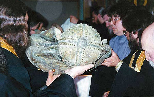 It was decided to place the relics in the new wooden coffin. The clergy did not know how fragile the body was, and so they laid a sheet underneath it and only then did they transfer the relics to the new coffin, while singing the irmoi of the Great Canon of St. Andrew [from the Service of the Burial of a Priest], "He is my Helper and Protector, and has become my salvation …. Establish Thy Church upon the rock of Thy commandments, O Christ." With the remains of Vladika John now in the new coffin, the clergy began to clean them of the decayed lining (and pillow) from the old coffin. The body of Vladika John, when it was lifted up high, turned out to be relatively light in weight and stiff, not flexible or fragile as would have been expected. It is worth noting what was experienced by the participants of the examination: after the uncovering of Vladika John's face an extraordinary spiritual peace and reverent silence were felt. No one was amazed, no one spoke. All sensed a feeling of well being and how grace-filling it was to stand by the relics. There was no hurrying or fussing. No one wanted to leave the relics; there was a desire simply to stand by them, pray, and touch them.