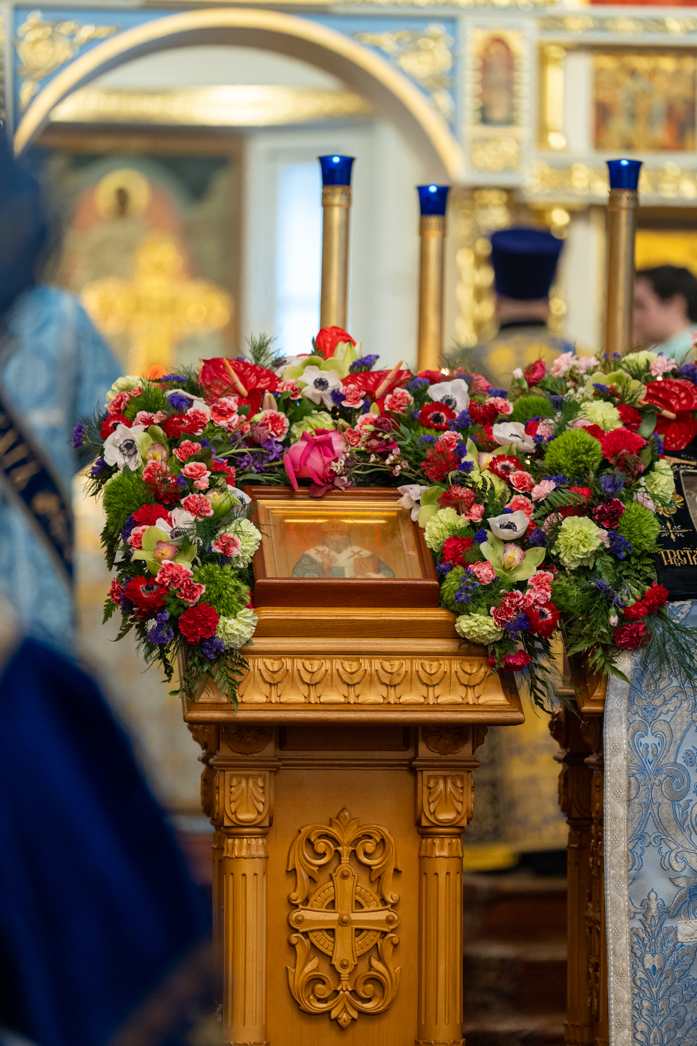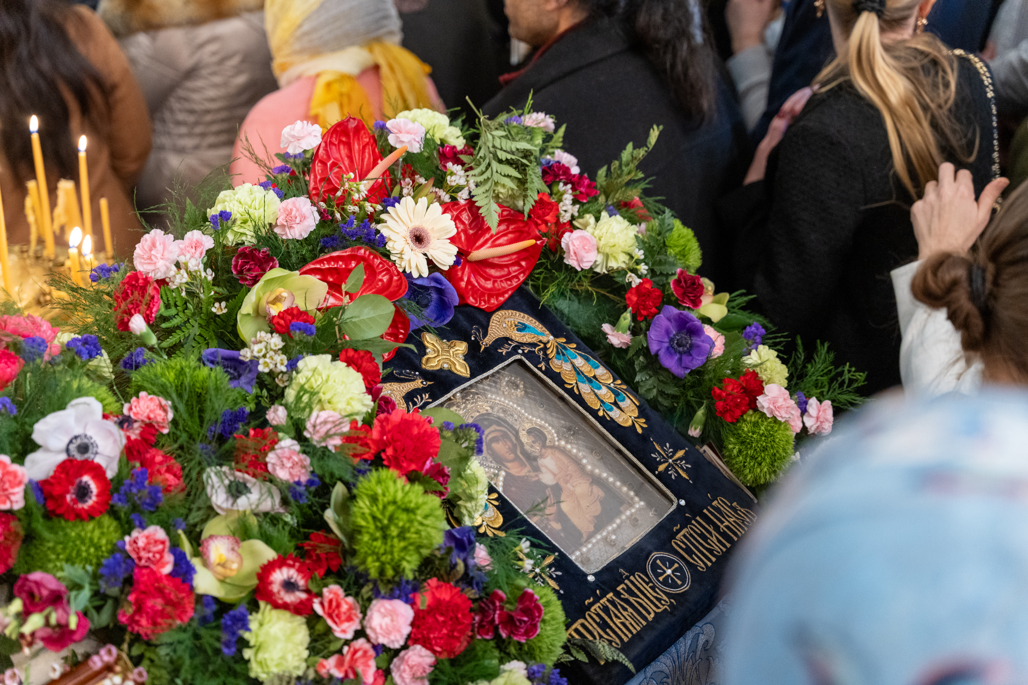 За Божественной литургией верующие, собравшиеся поздравить Высокопреосвященнейшего владыку с днем Ангела, имели возможность поклониться мироточивой иконе Божией Матери "Иверско-Гавайской".