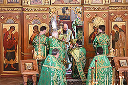 На следующее утро Высокопреосвященнейший митрополит Николай возглавил служение Божественной литургии в Серафимовском соборном храме Успенской женской обители «Ново-Дивеево». Его Высокопреосвященству сослужили епископ Манхэттенский Феодосий и монастырский клир. За богослужением молились игумения Макария с сестрами обители и богомольцы.