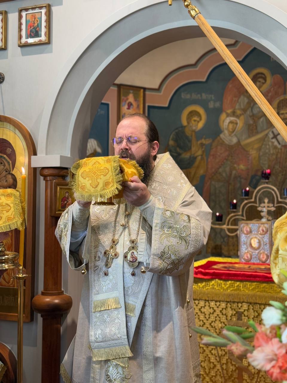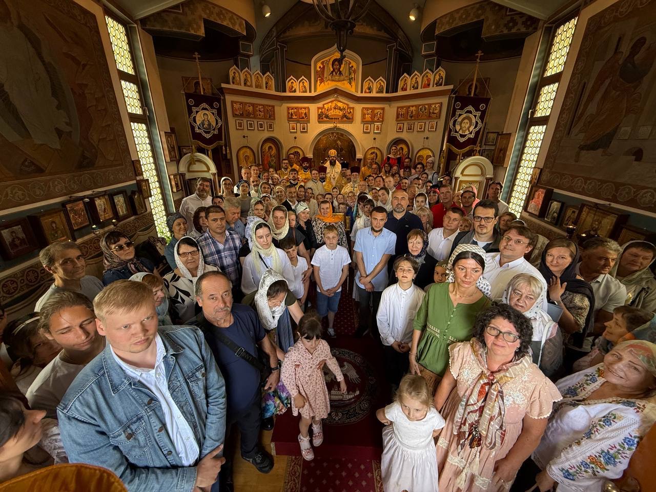 The solemn all-night vigil on the eve of the feast was beautifully performed by the parish choir under the direction of Mother Veronica, after which Bishop Irenei shared a meal with the local clergy, members of the parish council, and other representatives of the parish administration. The next day, after the hierarchical greeting with bread and salt, a solemn Divine Liturgy in honor of the Holy Apostles was celebrated in the magnificent Luxembourg church — a gift to the faithful from the late Archpriest Sergei Poukh and his devoted widow, Matushka Emilia. Within these beautiful walls of the church, the archpastor and clergy led the prayers of the people of God and brought everyone to the holy communion of the Divine Mysteries of Christ.