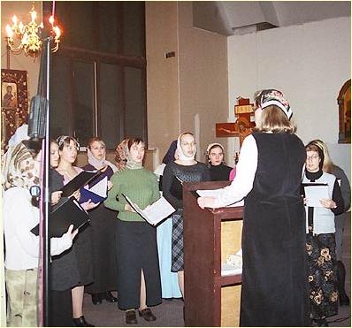 Elena Vasilievna Perekrestov conducts the womens’ choir on the left