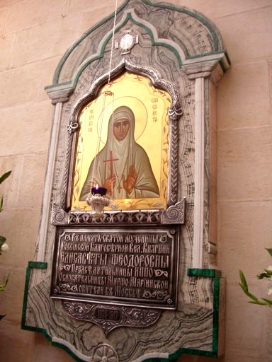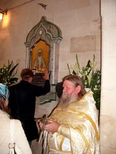 1 ноября в храме Александро-Невском на «Русских Раскопках» было торжественно отмечено 25-детие прославления Новомучеников и Исповедников   Российских. В этот день родились два   великих русских святых – святой праведный   Иоанн Кронштадский и святая преподобномученица Великая   Княгиня Елизавета. Так совпало, что   именно к этому дню был готов кивот с   иконой святой преподобномученицы Елизаветы Фердоровны, которая после трагической смерти   своего супруга Великого Князя Сергия Александровича в 1905 г. стала вместо   него председателем Императорского Православного Палестинского Общества (ИППО) вплоть до   революции 1917 г. Члены ППО давно имели   желание сделать достойное приношение Княгине-мученице. И вот нашлась благодетельница родом из   Екатеринбурга, старанием которой был   сооружен из полудрагоценных уральских камней с серебрянной   отделкой кивот, а икона была написана   в Иерусалиме. На освящение кивота   собралось много гостей. Была совершена Божественная литургия   игуменом Андроником (Котляровым), и. о.   Начальника Русской Духовной Миссии. Пели   сестры из Гефсиманской обители. За   литургией молилась группа паломников   из России, многие из которых приехали   из Екатеринбурга. Среди гостей также   был архимандрит Тихон – новый Начальник   московской РДМ. После освящения была предложена   трапеза в стенах Александровского   подворья.