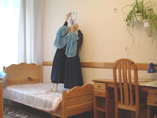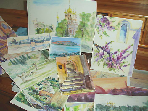 Все воспитанницы и сотрудники с большим благоговением приложились ко кресту-ковчегу, в который вложены святыни, драгоценные для каждого верующего сердца – частицы святой земли и святых камней. Читаешь их названия, и будто погружаешься в Священную историю – здесь Вифлеем и долина Реки Иордан, Сионская Гора и Гора Искушений, Магдала и Фавор, Гефсимания и Голгофа. А потом девочки с восторгом рассматривали работы Гефсиманских сестер – легкие, прозрачные, воздушные – и примеряли, как они будут смотреться над их кроватками. Здесь будет серебристый сад со старыми оливами, а тут – нарисованный самой настоятельницей монастыря закат над Иерусалимом. Так святая Елизавета связала наш маленький приют с возлюбленной ею Святой Землей.