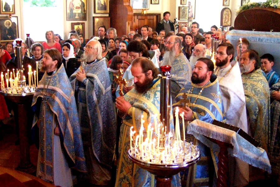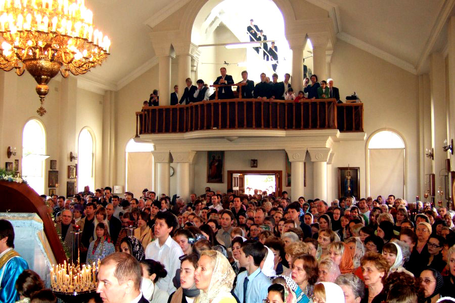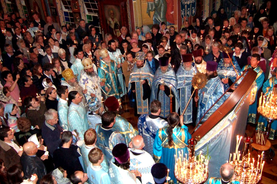 Митрополит Онуфрий, Архиепископ Евгений, их сопроводитель Протоиерей Михаил Бойков и др. вошли во храм всед за иконой. Это первый раз в истории Архиереской Крестовой церкви, когда ни только один, а сразу два архиерея РПЦ МП вошли в храм, чтобы вознести Богу и Его Пречистой Матери совместную молитву с духовенством и народом РПЦЗ.