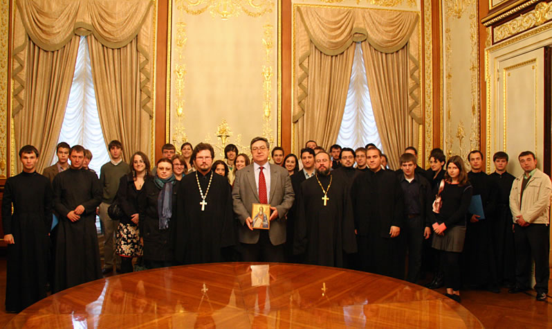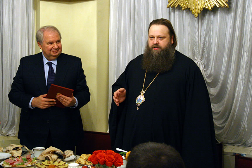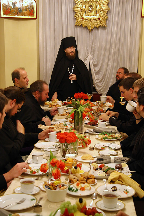 По окончании богослужения участникам симпозиума была предложена трапеза, за которой с теплыми словами приветствия к православной молодежи обратились епископ Меркурий и посол Российской Федерации в США Сергей Иванович Кисляк.