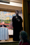 Во время своего выступления на обеде Владыка поделился о своем приходе в честь святителя Николая в Вене, о том, что это самый величественный храм Московского Патриархата вне канонической территории Русской Православной Церкви и что недавно был произведен полный ремонт храма, в связи с чем в конце декабря сего года в Вене ожидают приезд Его Святейшества, Святейшего Патриарха Алексия, для освящения храма. Влыдыка пригласил всех на это радостное событие. Говоря о своей епархии и о Русской Церкви в целом, владыка отметил, что, несмотря на высказывания многих о том, что мы живем в пост-христианскую эпоху, церковь в России и в рассеянии возрождается и крепнет. Растет число не только храмов, но и, что также очень важно, монастырей, которые наполняются молодыми людьми, ищущими спасения в служении Богу и Церкви. Поэтому, Владыка сказал, что характеризовать нашу эпоху как пост-христианскую неправильно.