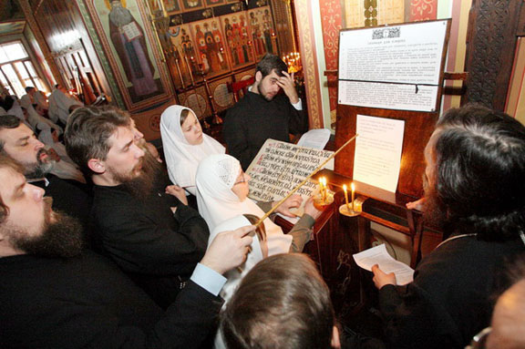 После окончания молебна и окропления верующих святой водой началось чтение похвального слова священномученика Климента Римского, положенное на этот день.