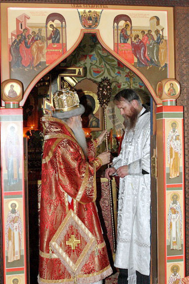 Я с душевным трепетом переступаю порог этого святого храма, для совершения в нем молитвы в престольный праздник и в день, когда мы вспоминаем 320-летие основания этого благолепного храма и 20-летие его возрождения после осквернения и опустошения. Мы с благодарностью Господу взираем на усердные труды, которые в течение двадцати лет совершаете Вы под руководством своего благочестивейшего настоятеля отца Иринарха. Мне очень трогательны слова Александра Гелиевича, с которыми он обратился ко мне и от Вашего имени преподнес образ Матери Божией „Неопалимая Купина“. В моей домовой церкви это будет постоянное напоминание о ваших трудах и о моем долге попечения о вас. Мы в начале нашей молитвы как бы обмениваемся дарами любви. Для меня сегодня огромная радость, что с нами сегодня будет молиться и совершать Божественную литургию Преосвященный епископ Иоанн. Русская Зарубежная Церковь, к которой он принадлежит, прошла тяжелый путь испытаний. И мы счастливы, что Господь дал нам радость пребывать теперь в молитвенном общении. Мы молимся и о блаженно почившем Святейшем Патриархе Алексии (скоро исполнится год со дня его блаженной кончины), и о Владыке митрополите Лавре, которые стали символом единства нашей Святой Русской Православной Церкви. Я хотел бы, возлюбленный Владыка Иоанн, от имени общины и духовенства единоверческой церкви Михаила Архангела преподнести Вам эту святую митру, чтобы Вы сегодня в ней приняли участие в богослужении, и она всегда напоминала Вам о нашей совместной молитве».
