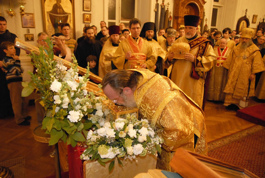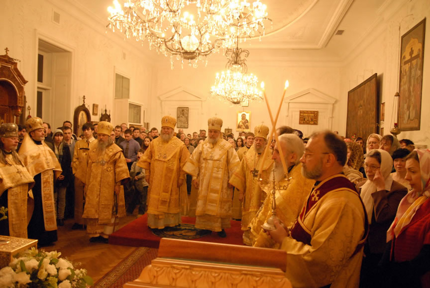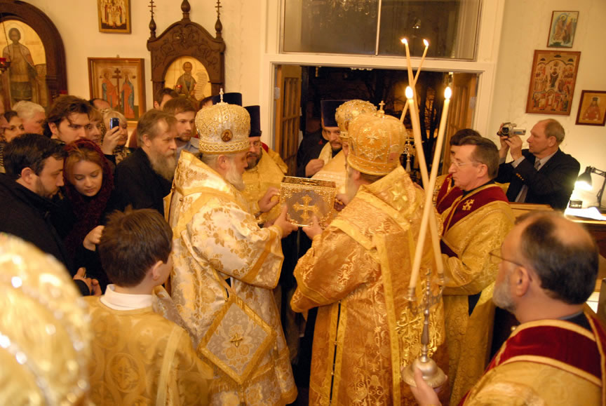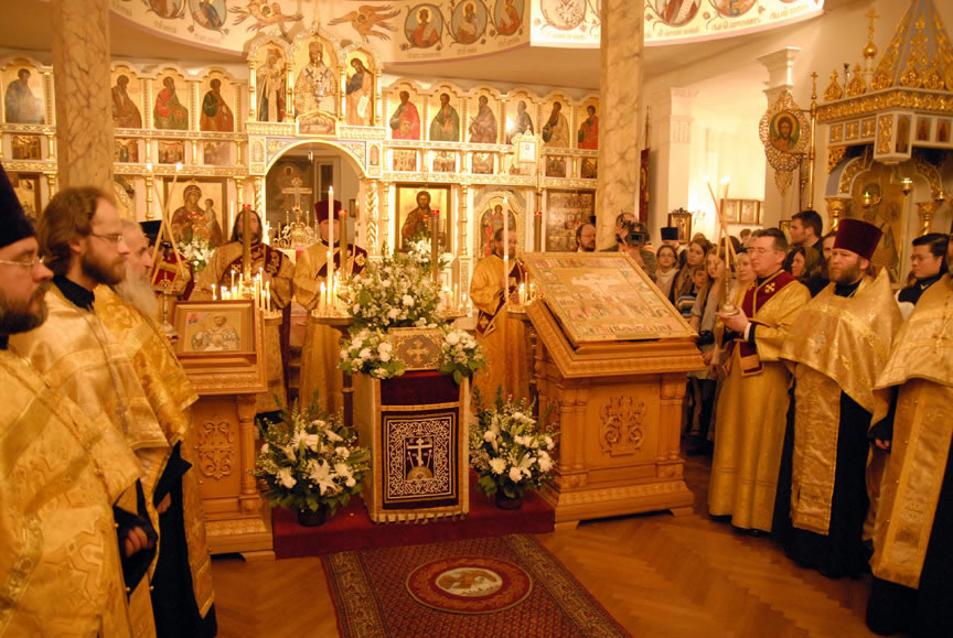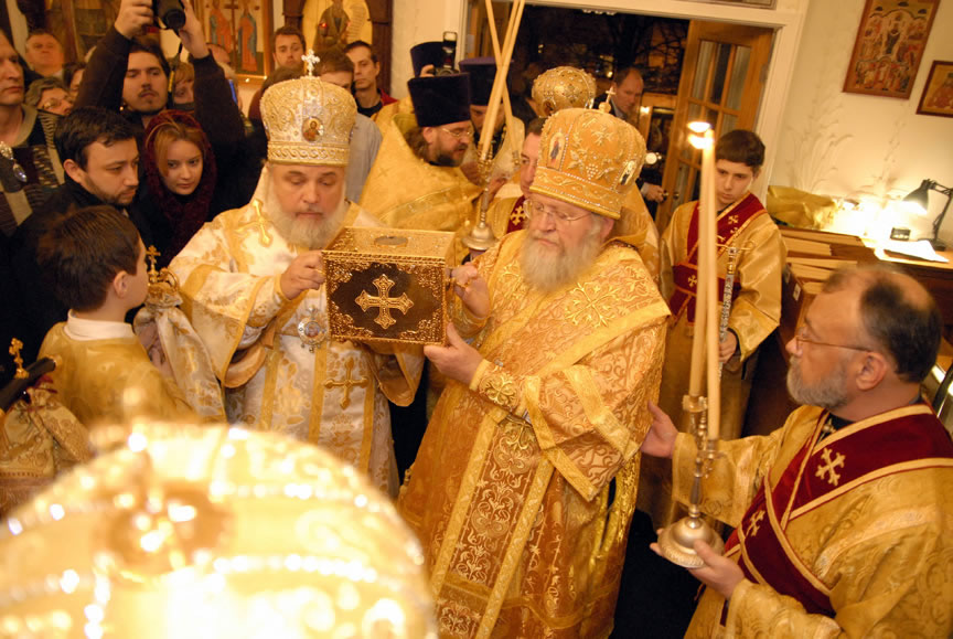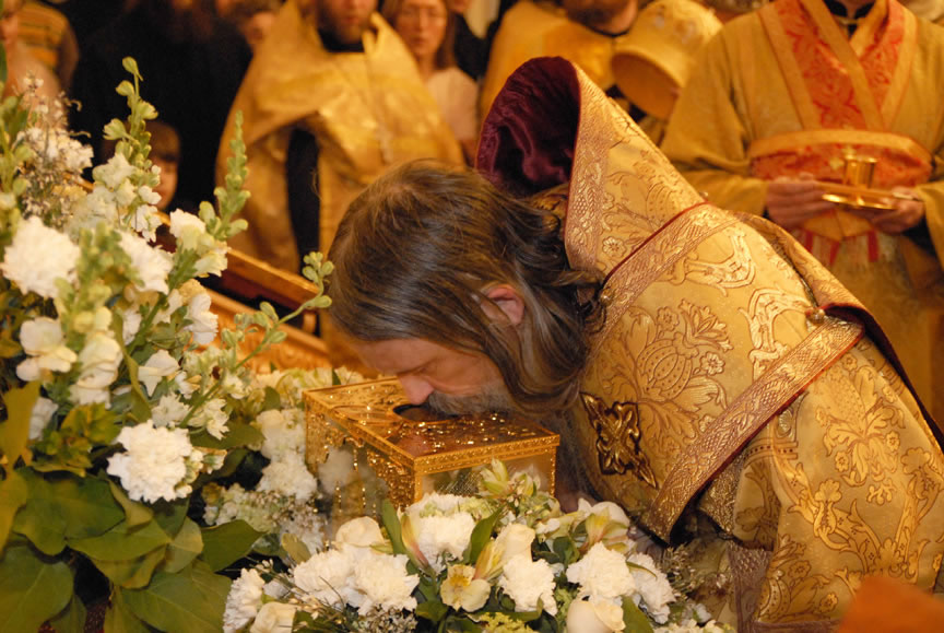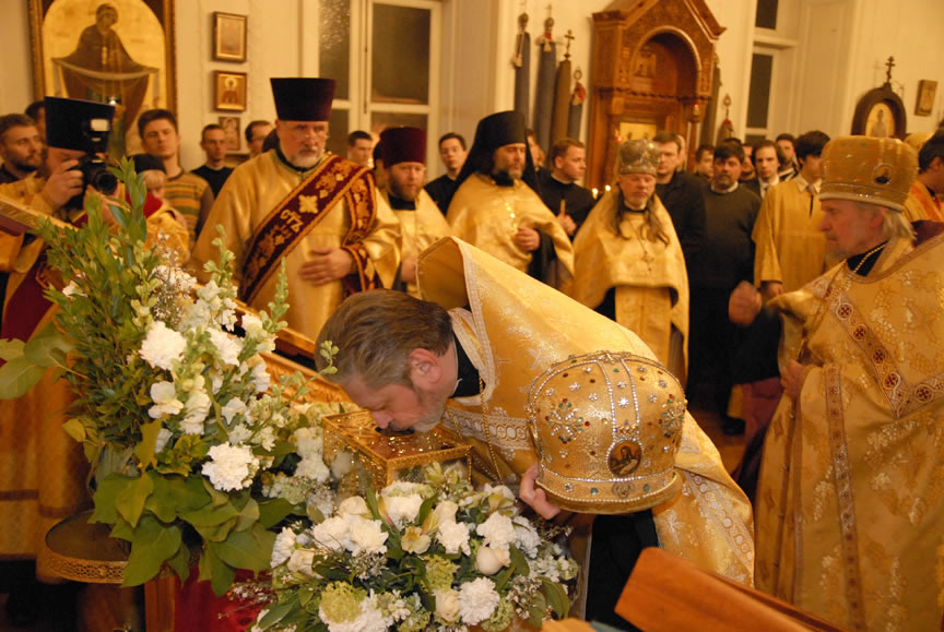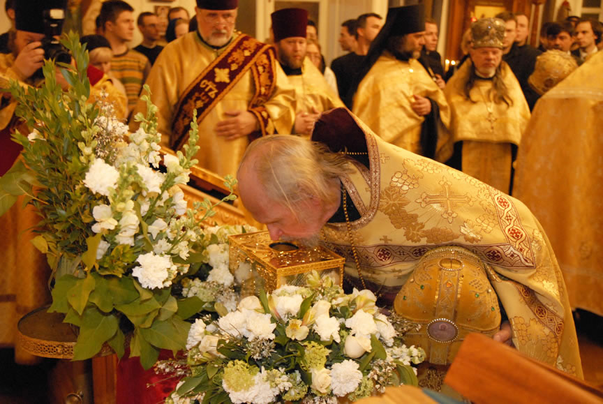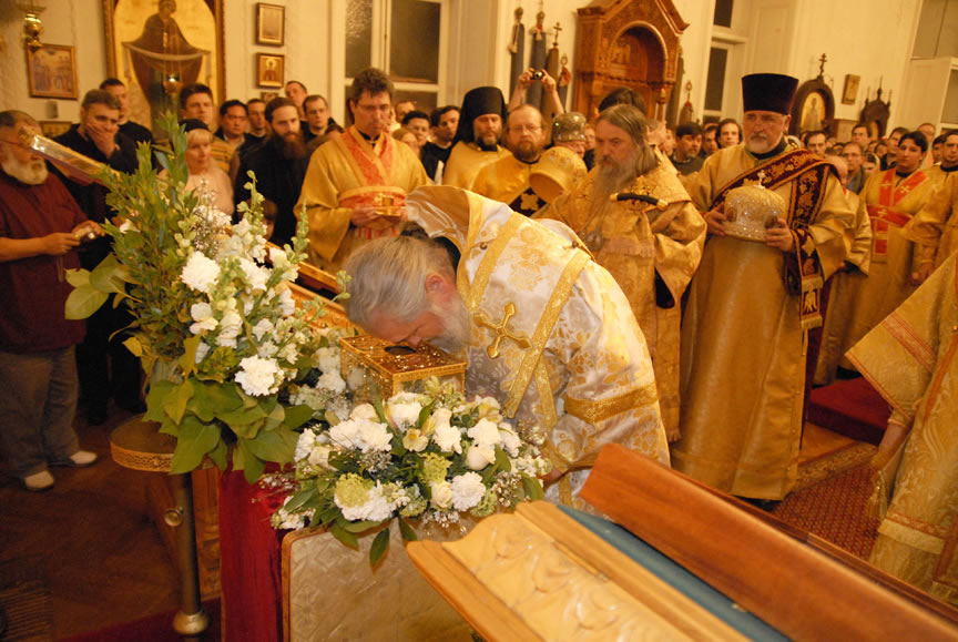 6 февраля во время всенощного бдения под пение «Хвалите имя Господне» ковчег со святыней был принесен ключарем Храма Христа Спасителя протоиереем Михаилом Рязанцевым в Знаменский Синодальный собор. На следующее утро Божественную литургию в Синодальном соборе возглавил епископ Монреальский и Канадский Гавриил, праздновавший в праздник Собора Новомучеников и Исповедников Российских свое тезоименитство.