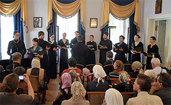 "Певчие хора выросли в разных семьях - некоторые в православных, некоторые присоединились к нашей Церкви уже по мере возрастания своего в "стране далече". Мы надеемся, что этот концерт принесет вам духовную радость и поможет продолжать свое служение", - сказал епископ Феодосий перед началом концерта, обращаясь к гостяи и сестрам милосердия, собравшимся на концерт.