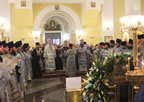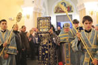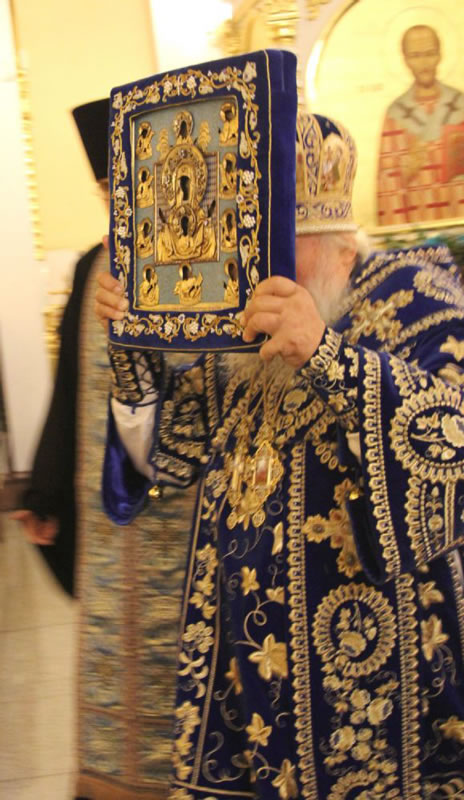 Богослужение началось с торжественного принесения в Покровский кафедральный собор древнего образа – Курской-Коренной иконы Божией Матери «Знамение». Перед образом митрополит Владивостокский и Приморский Вениамин возглавил соборный молебен, а затем состоялось служение Божественной литургии.