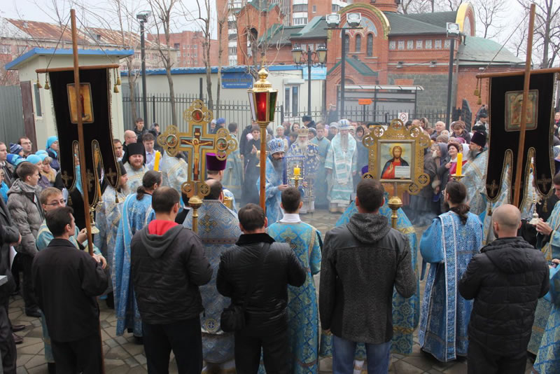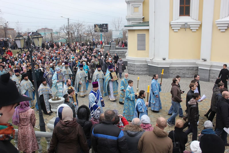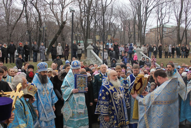 Сотни приморцев пришли в это утро помолиться перед древней святыней – Курской-Коренной иконой Божией Матери "Знамение". Завершилась Божественная литургия крестным ходом с чудотворной иконой Божией Матери вокруг Покровского кафедрального собора.