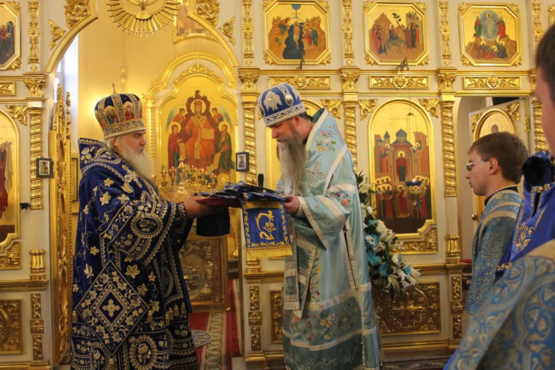 Далее архиепископ Кирилл вручил Синодальную грамоту епископу Иннокентию, викарию Владивостокской епархии во внимание к усердным трудам на благо Церкви и в связи с днём рождения.