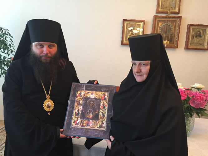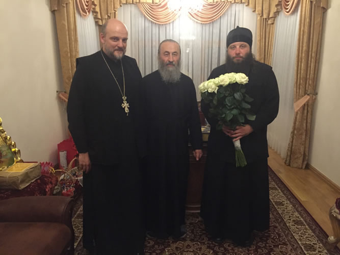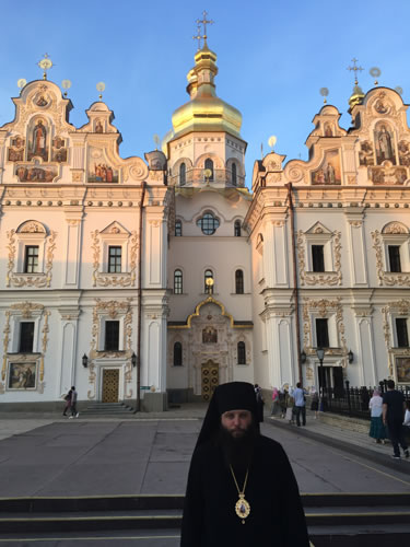 На следующий день, в праздник перенесения мощей святителя и чудотворца Николая, Преосвященный епископ Николай попрощался с паломниками, благословив их в путь, а сам направился в Киев, куда прибыл в тот же день вечером. В эти дни в Успенской Киево-Печерской Лавре проходила III Международная конференция «Афон и славянский народ», в которой приняли участие почетный Архиепископ Пражский и Митрополит Чешских земель и Словакии Христофор, игумен Афонского монастыря Хиландар архимандрит Мефодий и многие другие. С участниками этой конференции Преосвященный Николай братски беседовал за ужином в резиденции Блаженнейшего митрополита Киевского и всея Украины Онуфрия, отечески и с любовью принявшего всех. В своем приветствии Преосвященный Николай указал на братские узы, связывающие Киев, Почаев, Словакию и Сербию с Русской Зарубежной Церковью, и передал Блаженнейшему Онуфрию искреннюю любовь Высокопреосвященнейшего митрополита Восточно-Американского и Нью-Йоркского Илариона, архипастырей, пастырей, монашества и всей Полноты Русской Зарубежной Церкви, во всех своих храмах усердно молящейся о прекращении братоубийственной войны и воцарении мира в сердцах людей. За ужином Блаженнейший митрополит Онуфрий рассказывал о жизни Украинской Православной Церкви, а афонцы – о жизни святогорских обителей, о делателях Иисусовой молитвы.