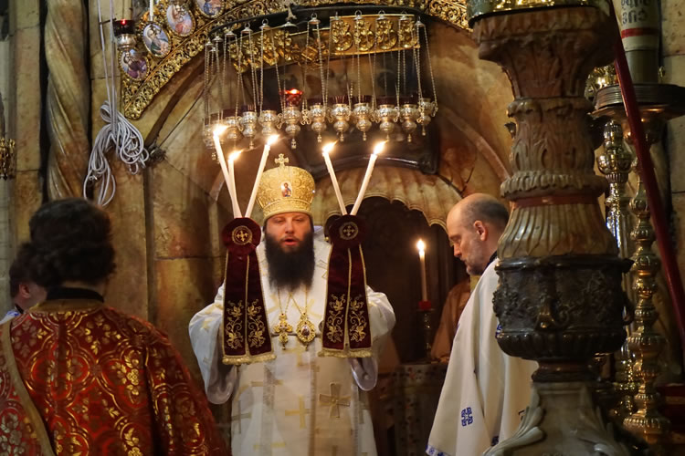 По благословению Блаженнейшего Феофила III, Патриарха святаго града Иерусалима и всея Палестины, в пятницу, 15 мая, Преосвященный епископ Николай с сопровождавшими его клириками и паломниками приняли участие в Божественной литургии на Гробе Господнем. Преосвященный Николай с митрополитом Капитольядским Исихием совершили Божественную литургию, причем Священное Ложе служило жертвенником, на котором совершалась Проскомидия стоя на коленях. А камень в приделе Ангела, на который была положена напрестольная доска, служил престолом. Этот всемирный алтарь открыт для всех с того времени, как Воскресший здесь Господь открыл для всего человечества райские двери.