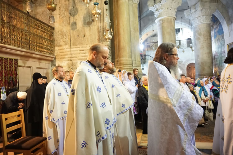 Паломники имели счастье молиться и за Божественной литургией на месте Рождества Христова в Вифлееме, совершенной священником Иерусалимского Патриархата, учившимся в Свято-Троицкой семинарии в Джорданвилле, и тепло принявшим Преосвященного Николая и спутников его, служивших и причастившихся здесь. Место Рождества Христова обнозначено серебряной звездой и латинской надписью: «Здесь от Девы Марии родился Иисус Христос». Над этим местом установлена мраморная доска, которая служит престолом, и на ней совершается Божественная литургия. Весь Вертеп, находящийся под просторной древней базиликой Рождества Христова, выложен мрамором и стены покрыты драгоценными материями. Пещера освещена многими лампадами и паникадилами. Сначала все паломники по очереди становились на колени и прикладывались к краю серебряной звезды под престолом и затем отходили в малое отделение, где были ясли, или становились на одну из лестниц, ведущих в эту пещерную церковь. Несмотря на тесноту из-за большого числа паломников, здесь паломники с большой радостью молились, чувствуя что-то высокое, что наполняет душу несказанным восторгом и благоговением.