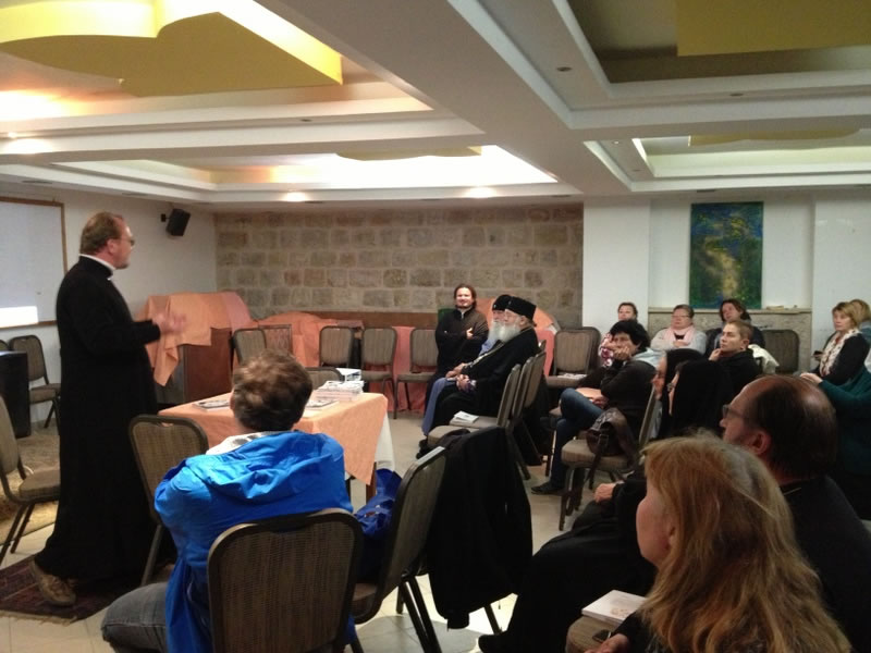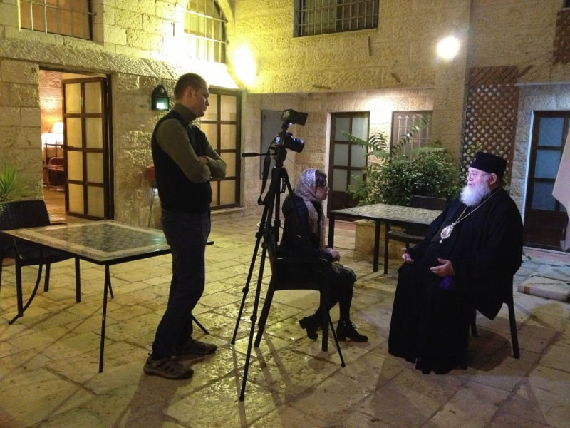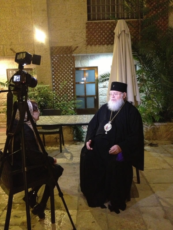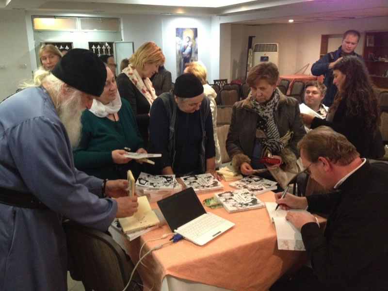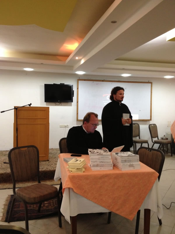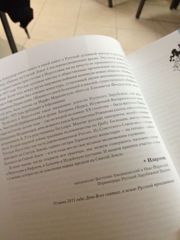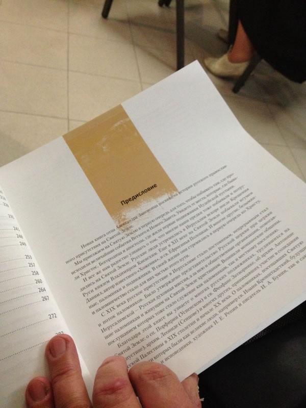В тот же день вечером Высокопреосвященнейший митрополит Иларион дал интервью телеканалу "Союз" и принял участие в презентации книги "Русские на Святой Земле", предисловие к которой он написал.