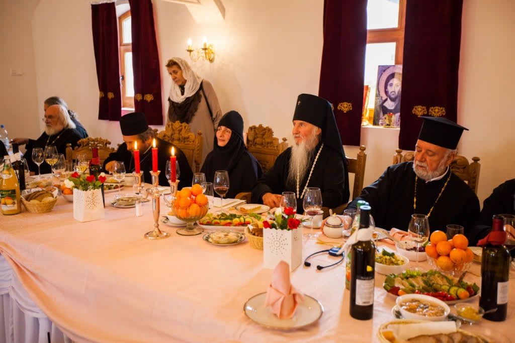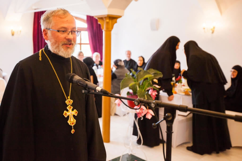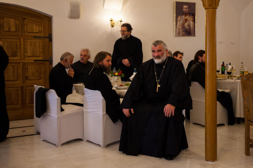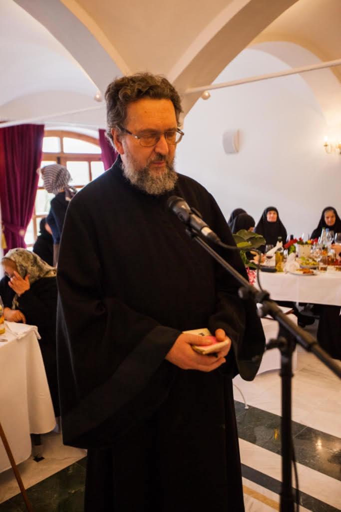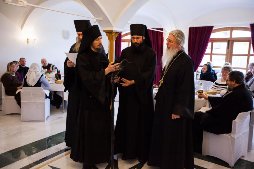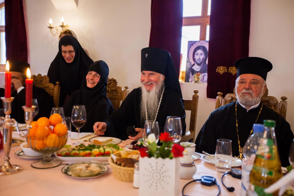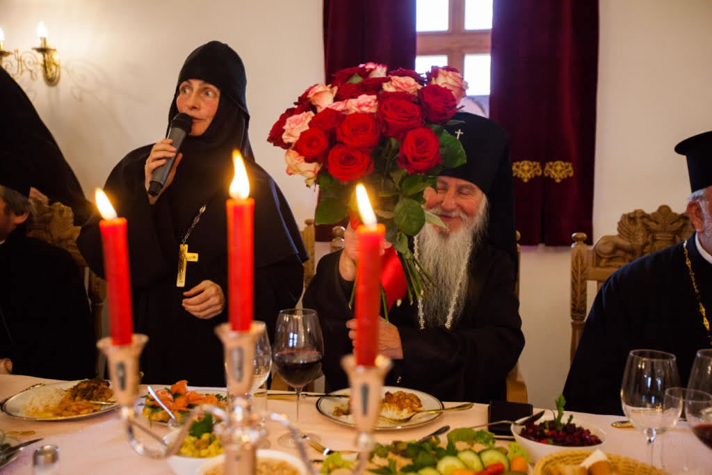 На торжественной трапезе прот. Апостолос Маламуссис, епископский викарий в Баварии, прочел поздравление митрополита Августина, главы греческой православной митрополии в Германии и экзарха Центральной Европы Константинопольского Патриархата. Затем были озвучены поздравления Его Святейшества, Святейшего Кирилла Патриарха Московского и Всея Руси и Высокопреосвященнейшего Илариона, Митрополита Нью-Йоркского и Восточно-Американского; за ними последовали теплые слова и поздравления с юбилеем всех священнослужителей и почетных прихожан, включая и старосты Свято-Успенского храма в Лондоне, Веры Александровны, приехавшей на праздник Владыки с представительницами сестричества. Торжественные речи и слова благодарности Владыке прерывались музыкальными поздравлениями хоров женского и мужского монастырей. Наш рассказ о прошедшем празднике дополнят фотографии р.Б. Павла Худякова, усердно старавшегося запечатлеть в хронику монастыря происходящее.