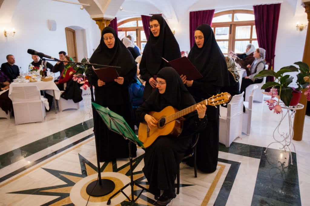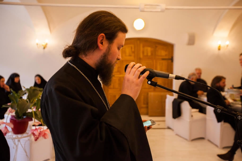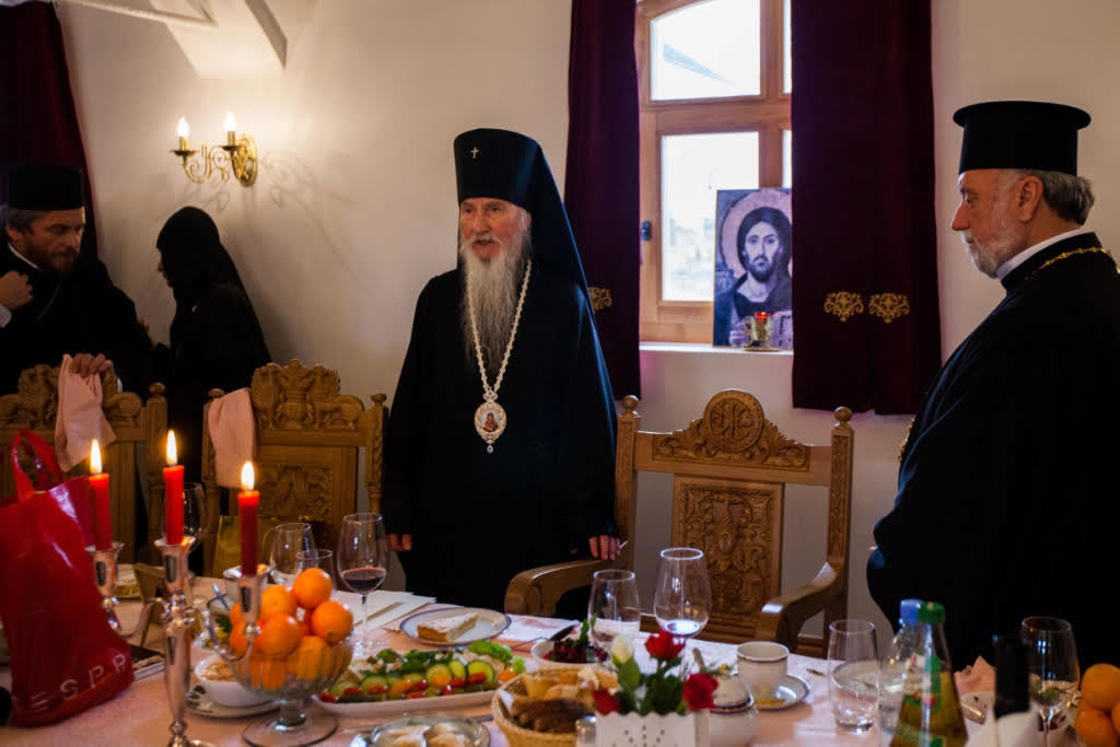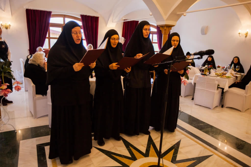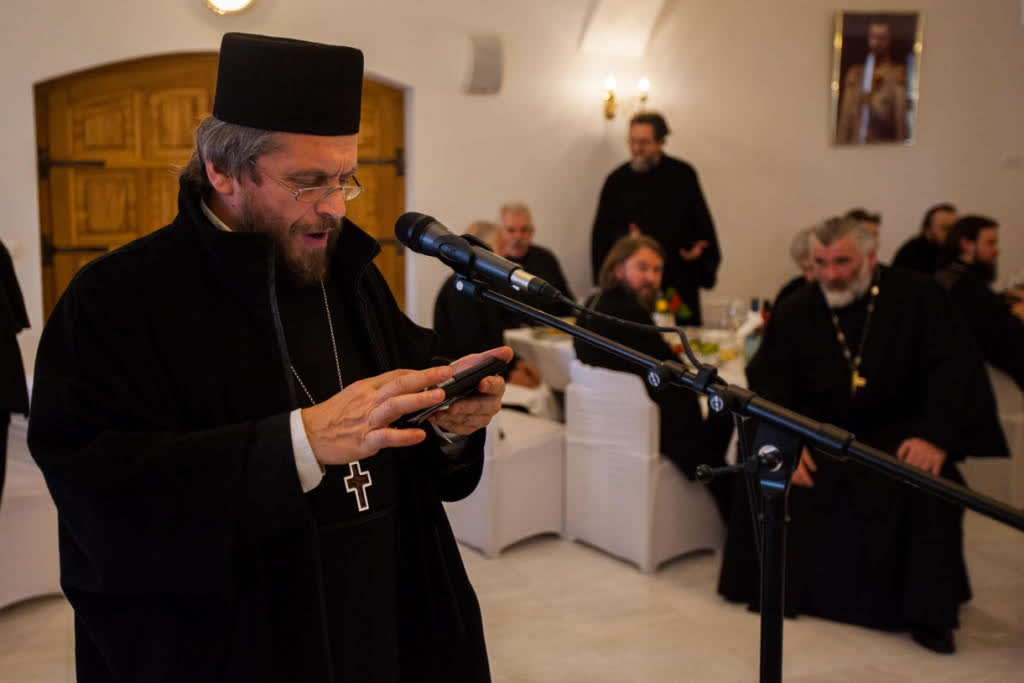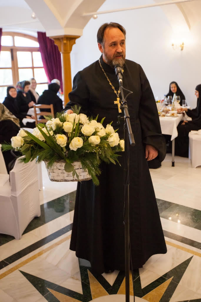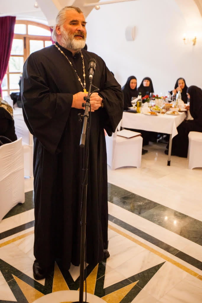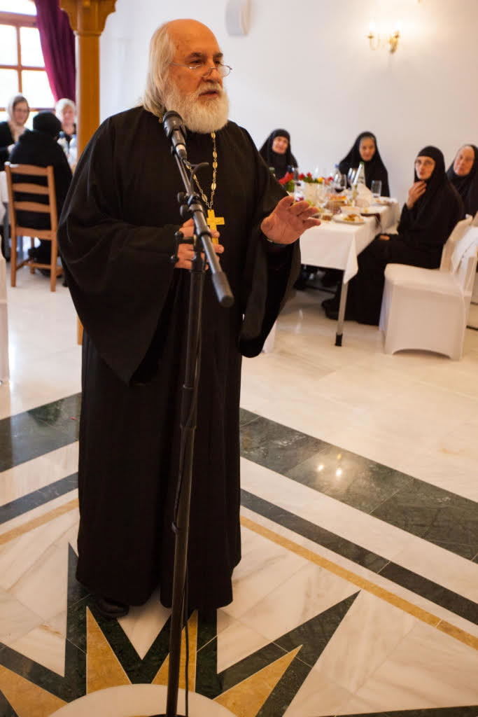 На торжественной трапезе прот. Апостолос Маламуссис, епископский викарий в Баварии, прочел поздравление митрополита Августина, главы греческой православной митрополии в Германии и экзарха Центральной Европы Константинопольского Патриархата. Затем были озвучены поздравления Его Святейшества, Святейшего Кирилла Патриарха Московского и Всея Руси и Высокопреосвященнейшего Илариона, Митрополита Нью-Йоркского и Восточно-Американского; за ними последовали теплые слова и поздравления с юбилеем всех священнослужителей и почетных прихожан, включая и старосты Свято-Успенского храма в Лондоне, Веры Александровны, приехавшей на праздник Владыки с представительницами сестричества. Торжественные речи и слова благодарности Владыке прерывались музыкальными поздравлениями хоров женского и мужского монастырей. Наш рассказ о прошедшем празднике дополнят фотографии р.Б. Павла Худякова, усердно старавшегося запечатлеть в хронику монастыря происходящее.