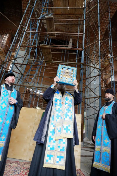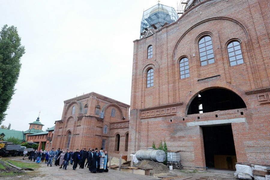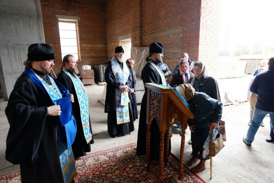 По дороге в Знаменский кафедральный собор глава митрополии посетил строящийся Преображенский храм, где помолился о скорейшем завершении строительства.