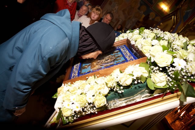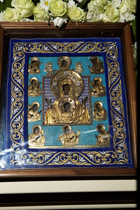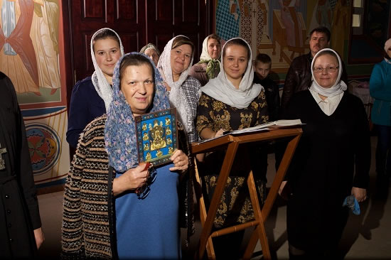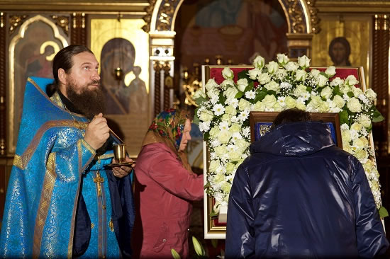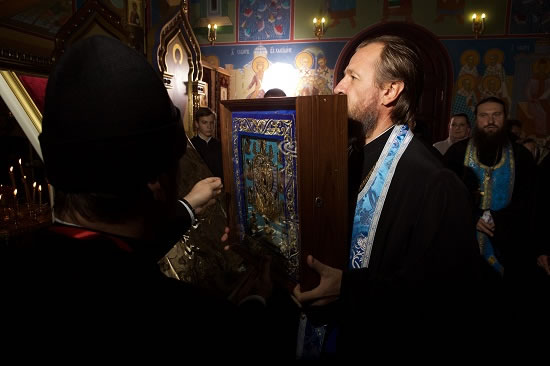 Перед отъездом духовенство района совершило молебное пение с чтением акафиста и помазали каждого богомольца благословенным елеем. И на протяжении пребывания чудотворного образа Божией Матери каждый час совершалось молебное пение с акафистом и помазанием елеем всеми благочиниями епархии, все священнослужители со своею паствою вознесли свои молитвы Богоматери.