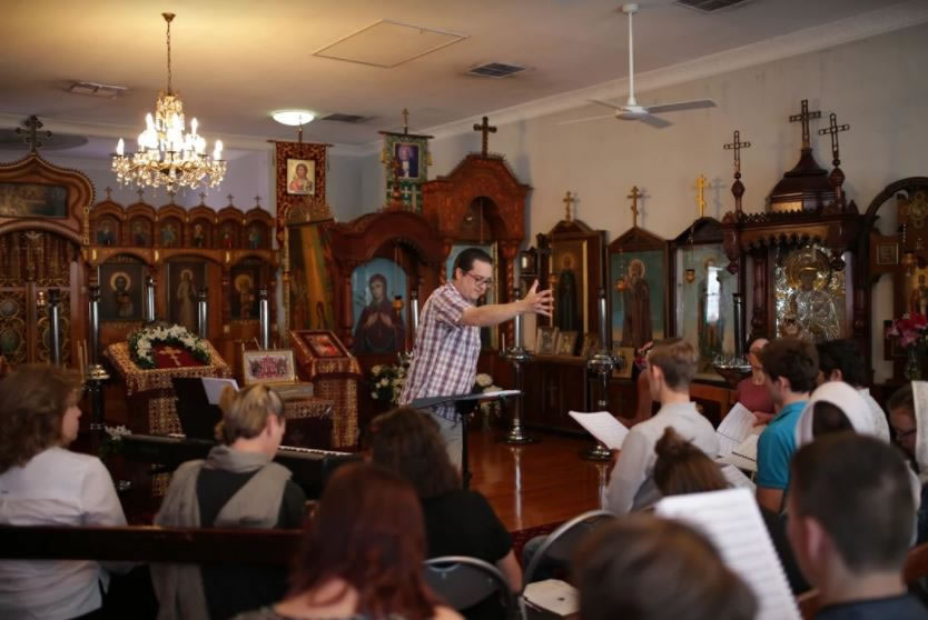 В храме 65 человек, большинство раньше вместе не пело никогда. Позади насыщенный впечатлениями день, восемь часов почти непрерывного пения. Регент, седовласый священник со строгими глазами, дает тон. Он тоже устал, только что после перелета с другой части глобуса. Первая читка нот с листа, где не до эмоций и впечатлений, попасть бы в свою партию.