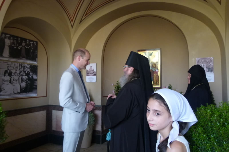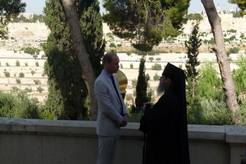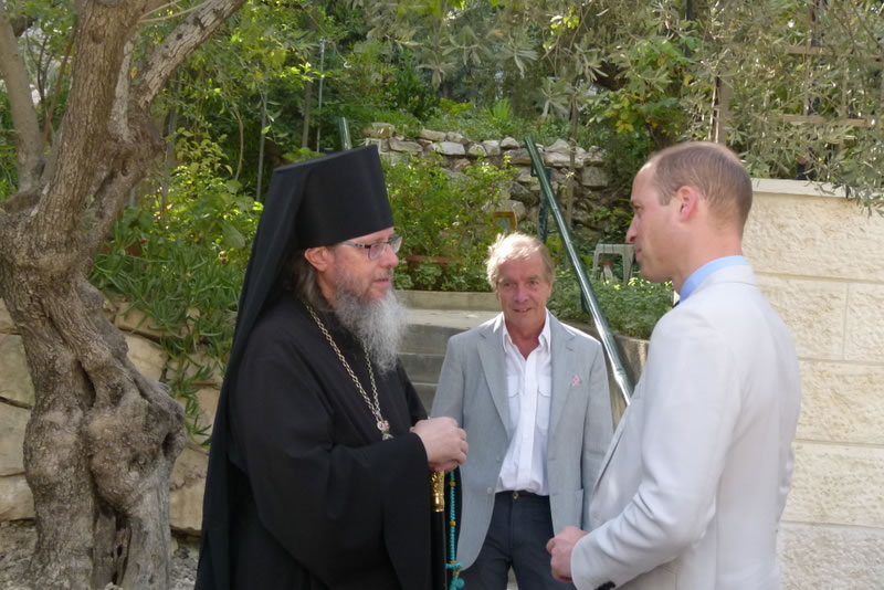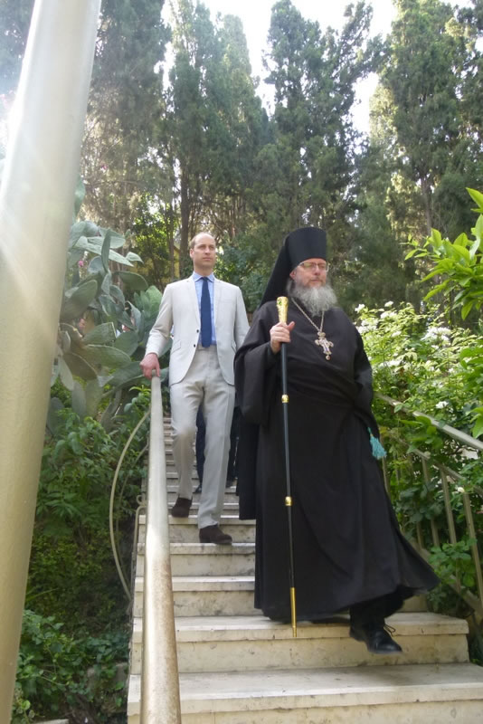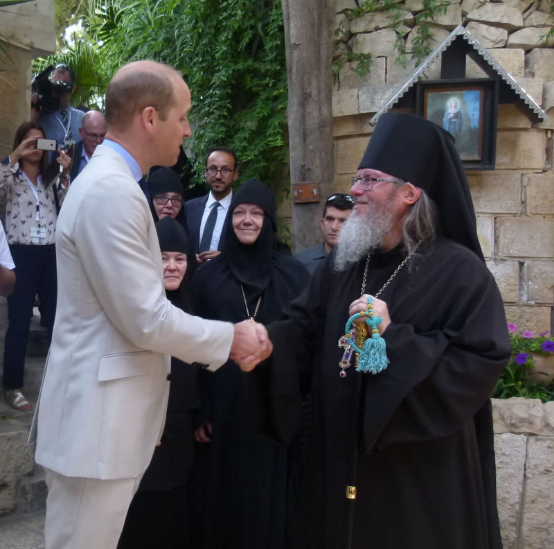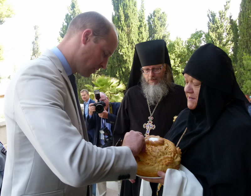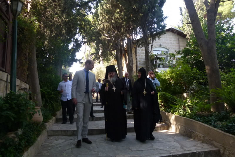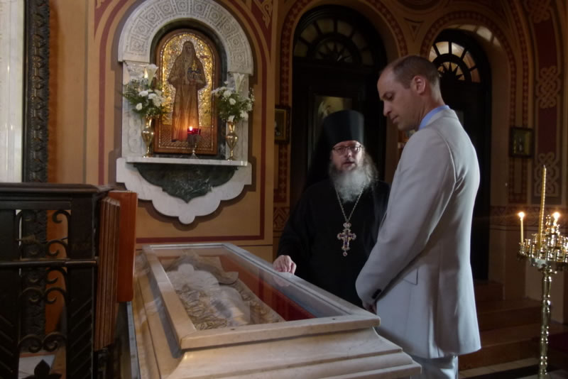 В четверг, 28 июня, Британский принц Уильям посетил русский женский монастырь равноапостольной Марии Магдалины в Гефсимании, где был встречен архимандритом Романом (Красовским), Начальником Духовной Миссии Русской Зарубежной Церкви в Иерусалиме, и настоятельницей обители игуменией Елизаветой с сестрами. Проследовав в соборный «Царский» храм обители, принц Уильям поклонился священной раке с мощами преподобномученицы великой княгини Елизаветы, мученически убиенной 100 лет тому назад в Алапаевске и нашедшей здесь место упокоения. Архимандрит Роман совершил краткий молебен у святыни, совершив поминовение Государыни Королевы Елизаветы и всего Королевского Дома. Молебен завершился многолетствием Государыне Королеве Елизавете, принцу Уильяму и всему Королевскому Дому.