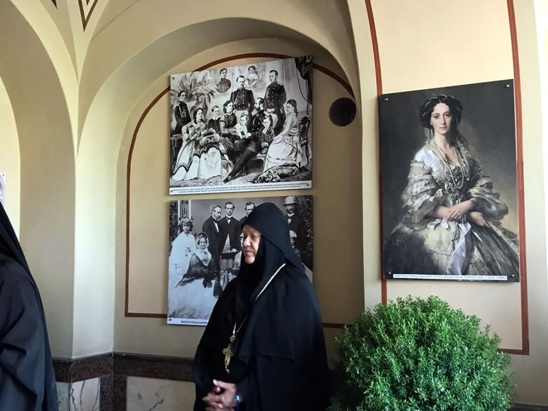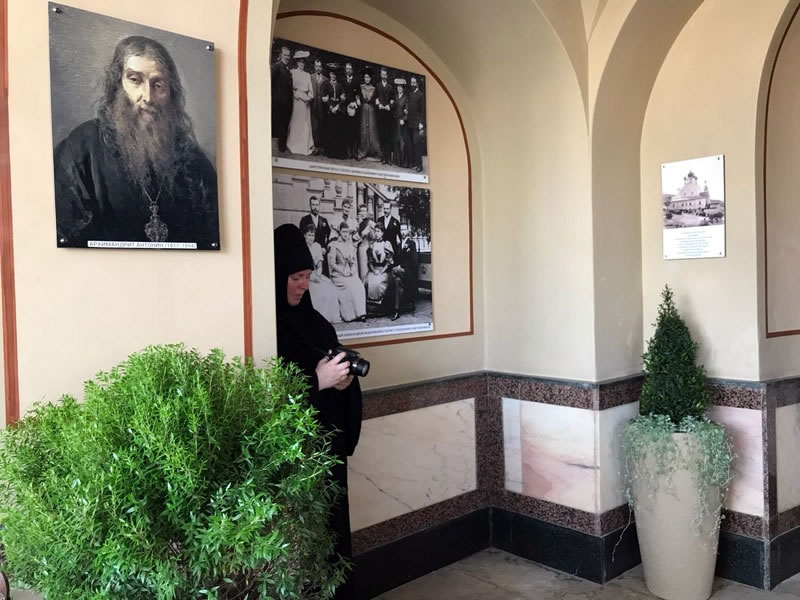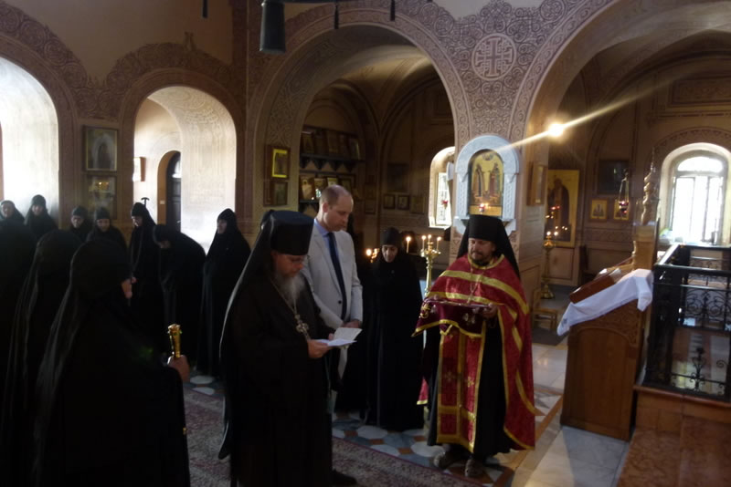 Возложив цветы на раку и поставив свечу, принц Уильям направился к раке преподобномученицы Варвары. Здесь архимандрит Роман рассказал об обстоятельствах мученической кончины преподобномучениц и князей, пострадавших с ними в Алапаевске, о добрых делах и милосердии Императрицы Александры Феодоровны, ее дочерей и сестры, истории и святынях храма, деятельности монастыря, миссии и Вифанской школы. Затем принц Уильям посетил усыпальницу своей прабабушки греческой принцессы Алисы, которая, согласно ее завещанию, была похоронена рядом со своей тетей по матери, преподобномученицей Елизаветой. И тут архимандрит Роман совершил заупокойную литию на английском языке, после чего принцу Уильяму была дана возможность помолиться здесь в одиночестве. Затем продолжилось общение принца Уильяма с начальником, настоятельницей, сестрами обители и ученицами Вифанской школы.