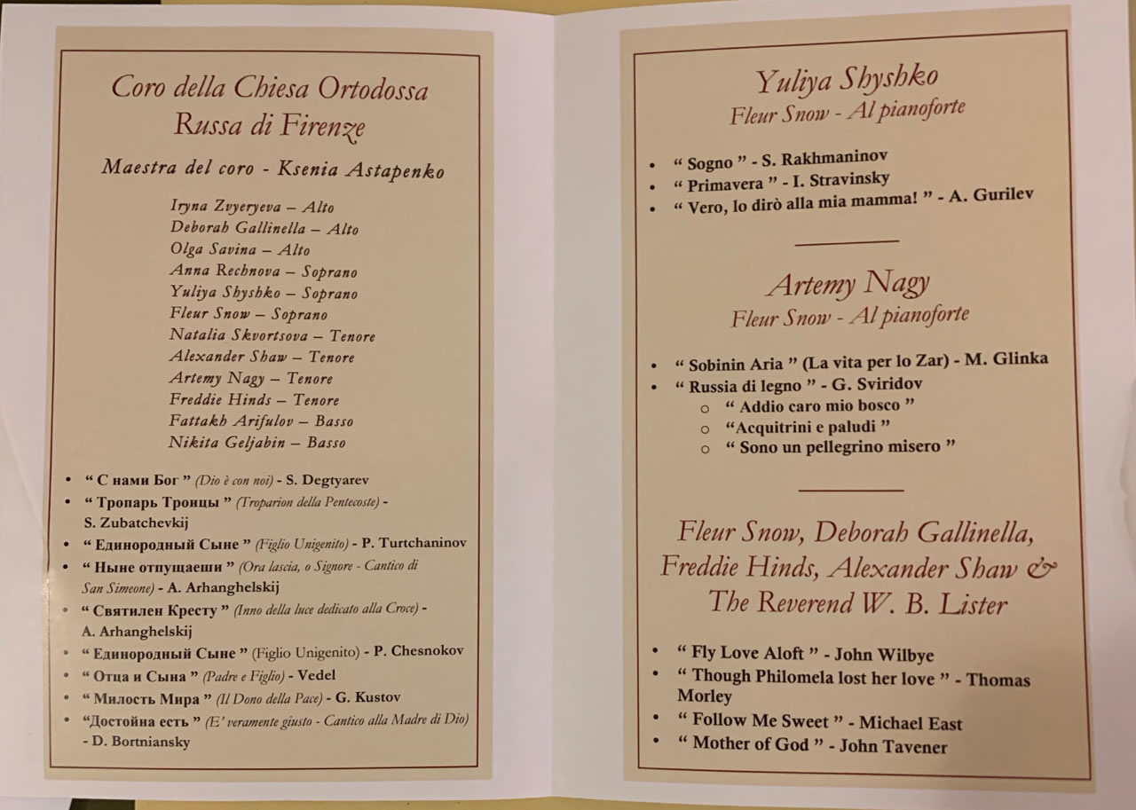 Во Флоренции Преосвященнейшего епископа Иринея встретили протоиерей Георгий Блатинский, священник Олег Тюркан, а также староста и другие члены прихода. В Родительскую субботу, а также в воскресенье – Неделю о Страшном суде - Его Преосвященство возглавил богослужения в сослужении местного духовенства. Во время чтения часов перед воскресной литургией епископ Ириней поставил Юрия Горчака во чтеца ддя несения своего церковного служения на приходе, а на Малом входе наградил священника Олега правом ношения набедренника. Между богослужениями в субботу и воскресенье был устроен специальный обед по случаю собрания приходского совета, на котором совет приветствовал епископа и воспользовался возможностью для знакомства и обсуждения духовных вопросов. Епископ Ириней также общался с регентом хора и певчими, чье великолепное пение за богослужениями Его Преосвященство не раз отмечал. В понедельник вечером в храме состоялся специальный концерт, устроенный в честь архипастыря.