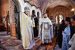 Богослужение праздника началось с торжественной встречи Начальника Миссии. В Божественной Литургии приняли участие миссийские клирики и священнослужители совершающие паломничество по Святой Земле.