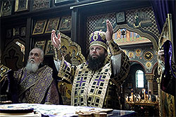 В субботу вечером, 10 апреля, епископ Николай возглавил Всенощное бдение, в сослужении иерея Александра Резникова при соборных протодиаконах.