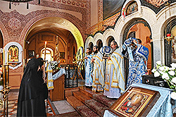 По завершении Литургии за монастырской трапезой был совершён «чин о Панагии», а затем игумения Елисавета с сестрами направились крестным ходом к камню, где апостолы встретили Божию Матерь, и Она поведала им о своем воскресении и о том, что теперь Она является их Ходатаицей перед Ее Божественным Сыном.