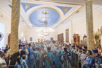 Перед началом богослужения все архиереи встретили нового Первоиерарха у входа в Знаменский собор в мантиях.