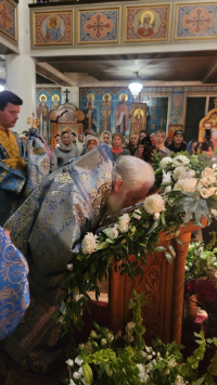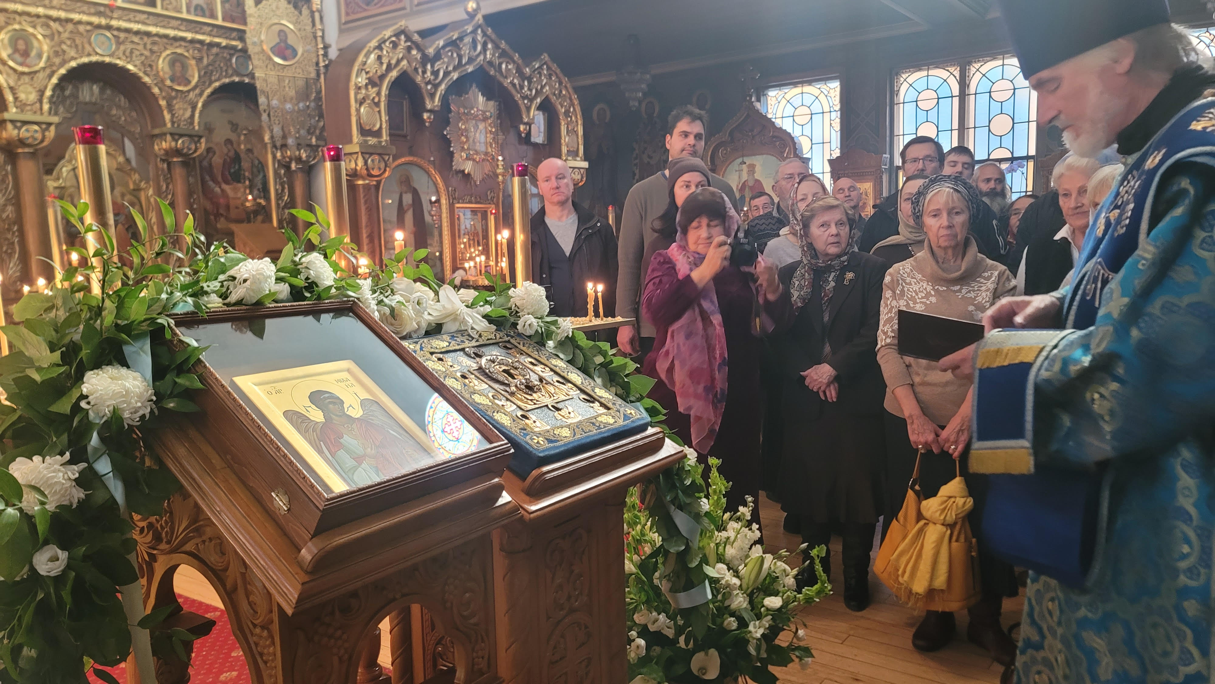 Завершающим днем пребывания в Канаде чудотворной иконы Божией Матери «Знамения» Коренно-Курская стал праздник Собора Архистратига Божия Михаила и прочих Небесных Сил бесплотных. На Михайлов день, в понедельник 21 ноября, в Свято-Троицком соборе Высокопреосвященнейший Гавриил совершил Божественную литургию в сослужении соборного духовенства: митрофорного протоиерея Владимира Мальченко, протоиерея Вячеслава Давиденко, а также иерея Дмитрия Чемериса, настоятеля Покровского храма в Гамильтоне, Онт. при соборном протодиаконе Александре Морине и диаконе Андрее Филимонове из прихода святителя Тихона в Кембридже, где Высокопреосвященный владыка Гавриил совершил воскресную Литургию. Праздничную всенощную в Свято-Троицком соборе правящий архиерей возглавил накануне, 20 ноября. Службы прошли при большом стечении народа – на полиелее к помазанию подошло более двухсот богомольцев, а уж в понедельник в соборе находилось никак не менее пятисотмолящихся. На Часах был пострижен во чтецы алтарник Петр Раков, а иподиаконства удостоились чтецы Сиф Давиденко и Андреас Петародас.