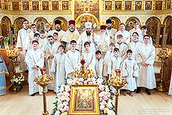 Первоиерарху Русской Зарубежной Церкви сослужили настоятель храма протоиерей Виктор Болдевскуль, клирики прихода и гости в священном сане. Храм был полон молящихся, практически все из которых причастились Святых Христовых Таин.