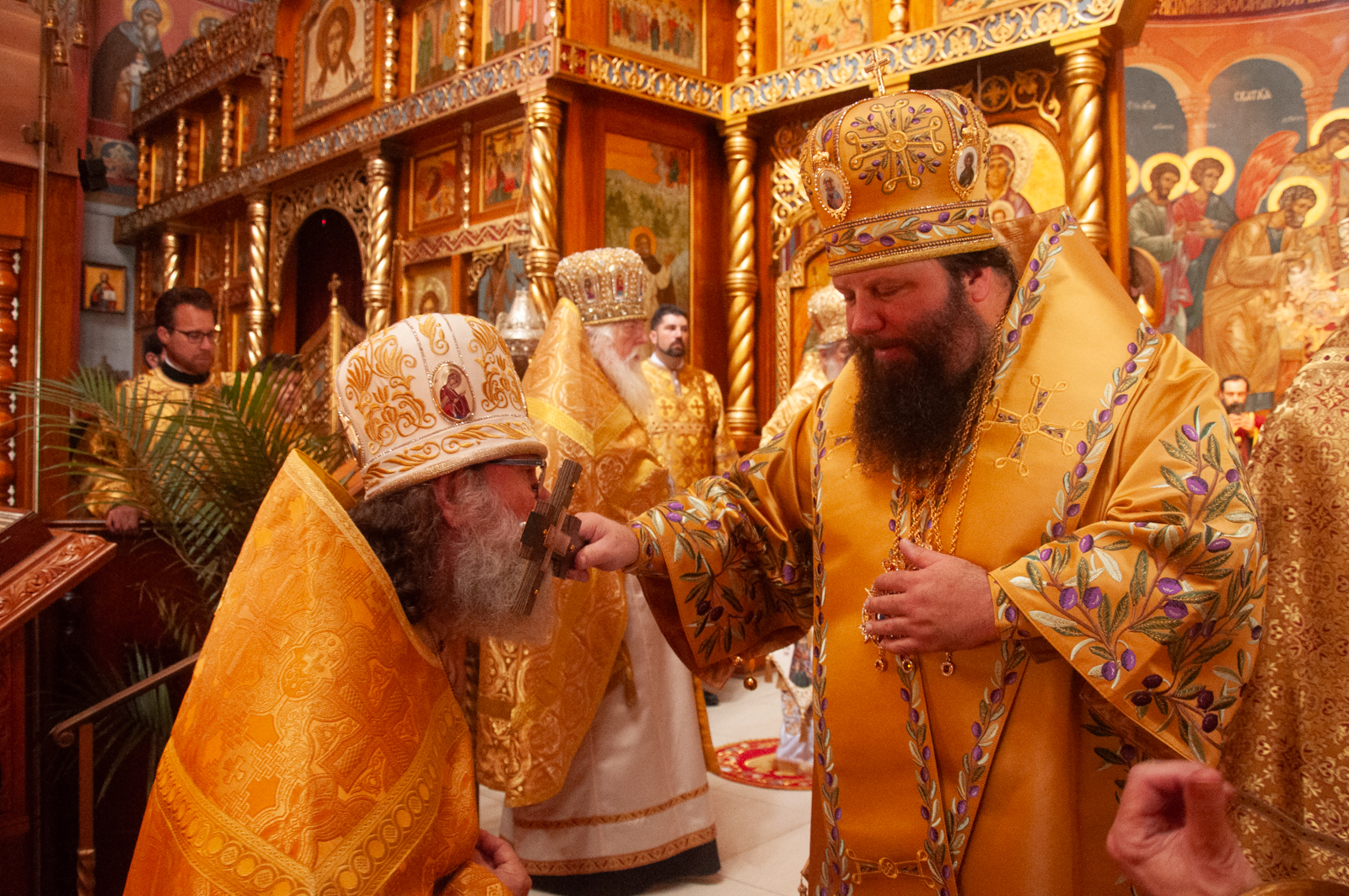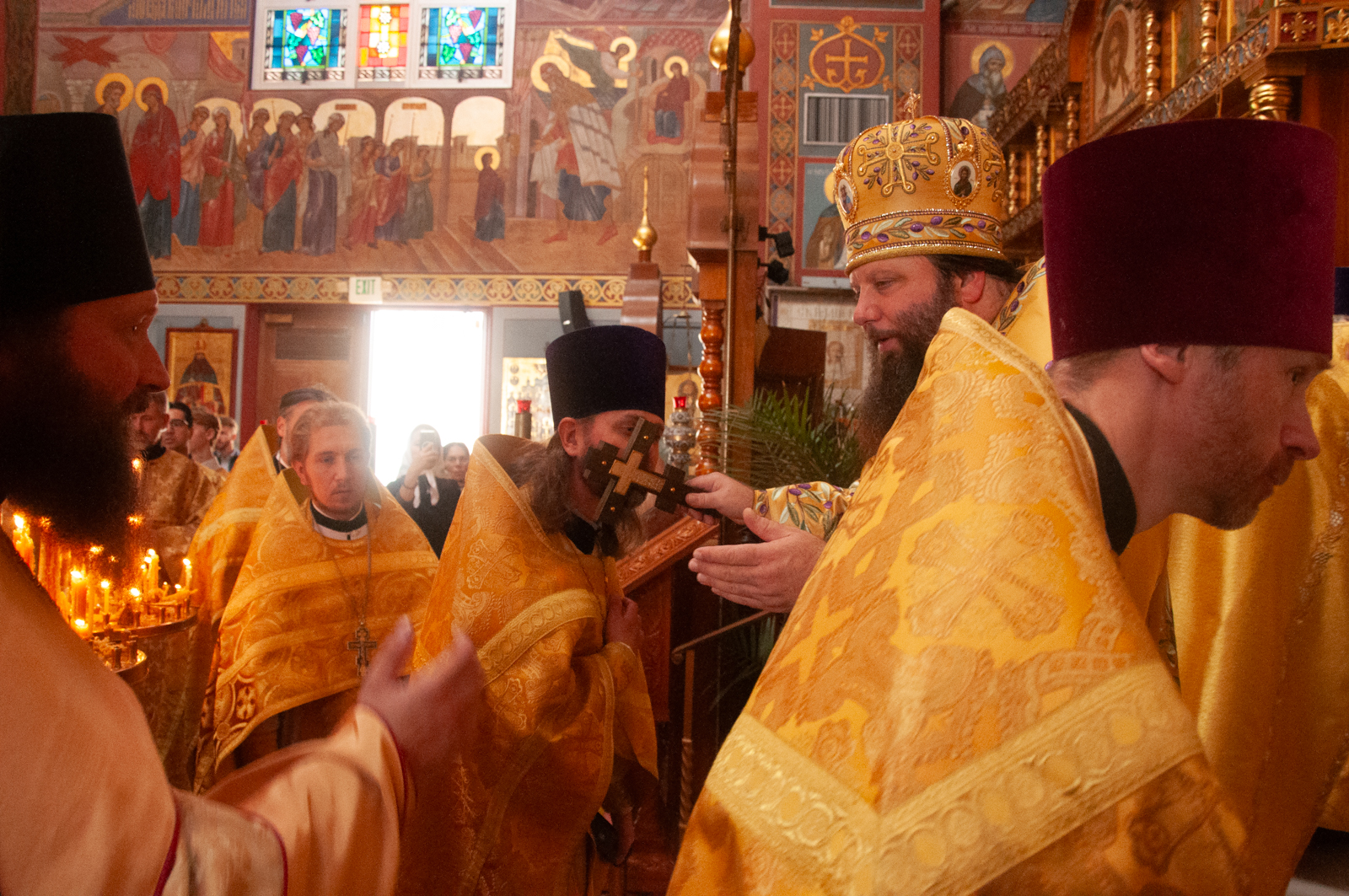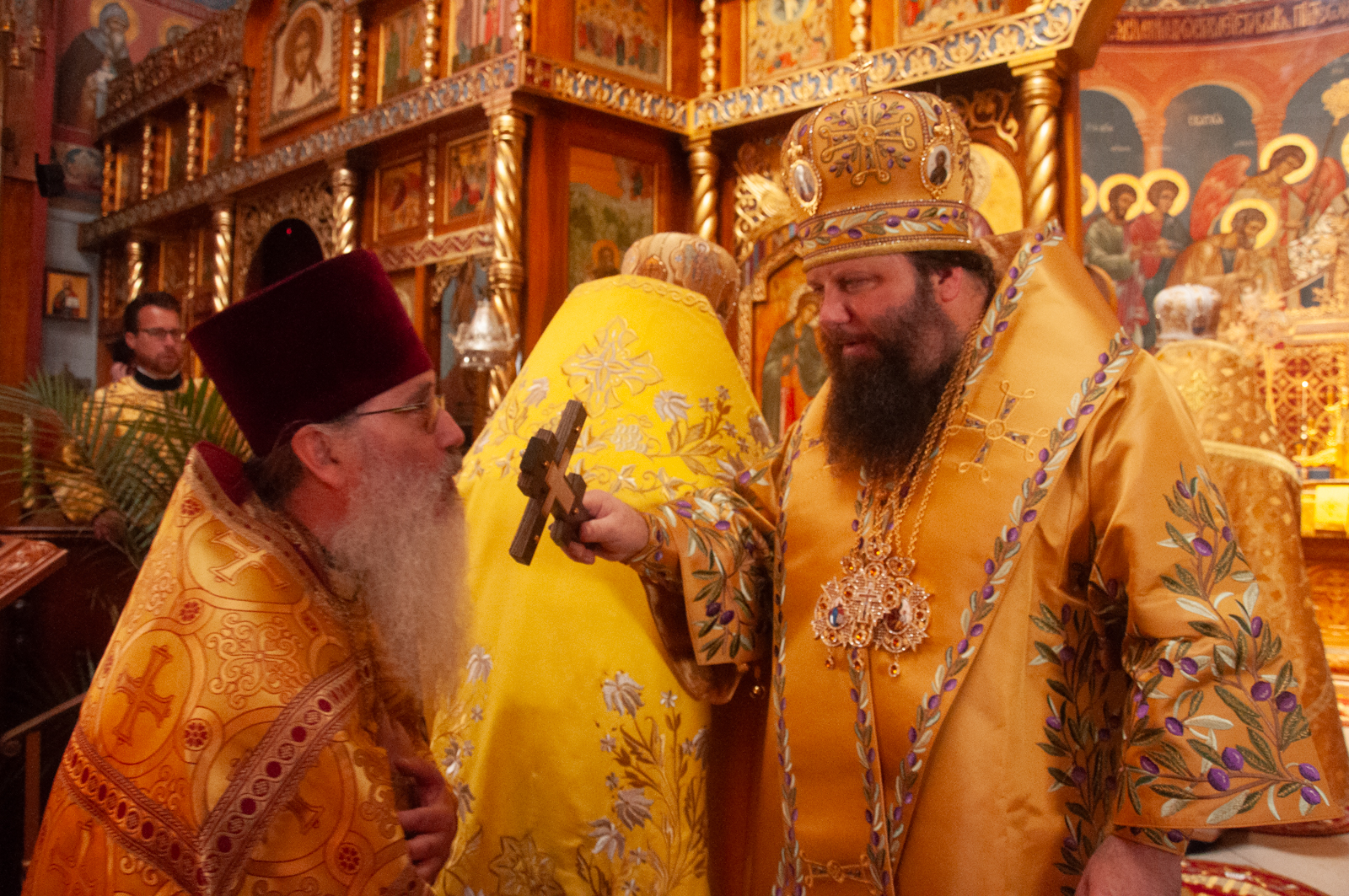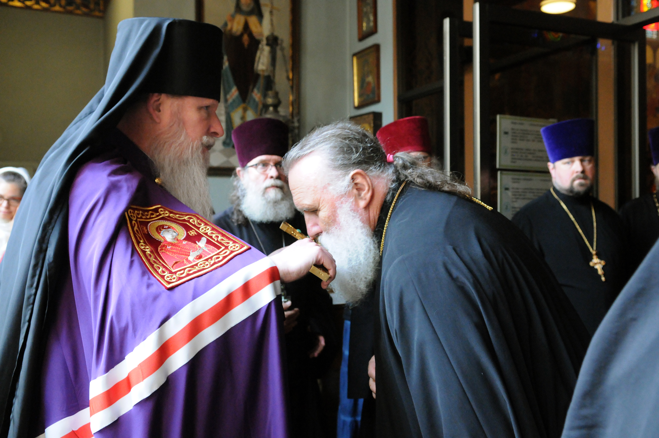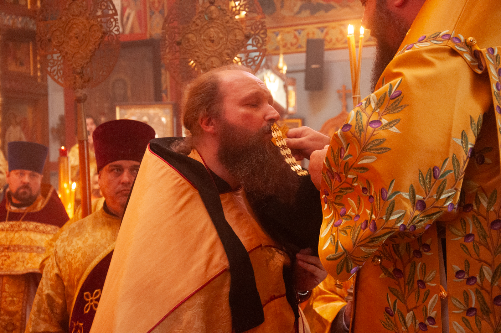 На малом входе Божественной литургии Первоиерарх Русской Зарубежной Церкви возложил золотой наперсный крест, Архиерейским Синодом выдаваемый, на иеромонаха Петра (Каракозова), клирика Западно-Американской епархии.