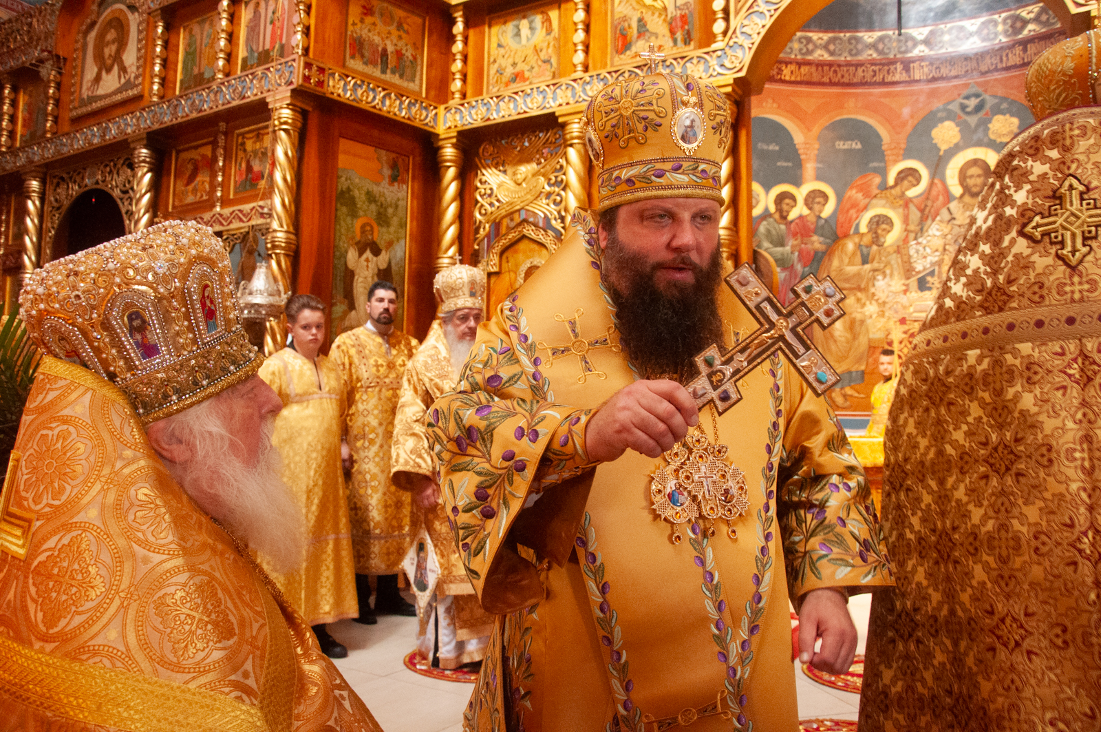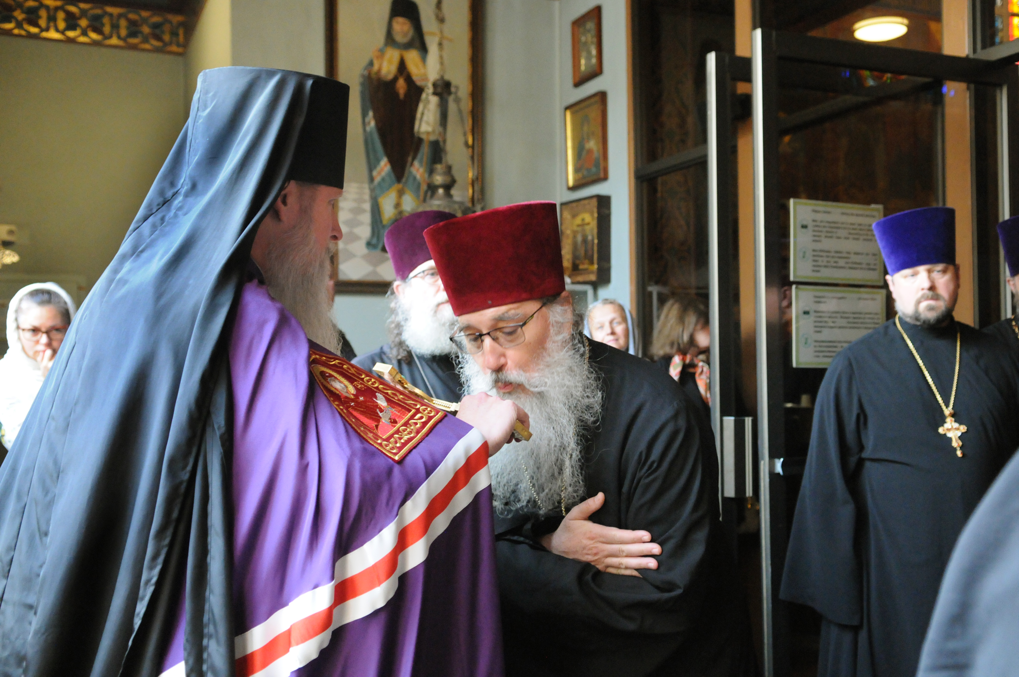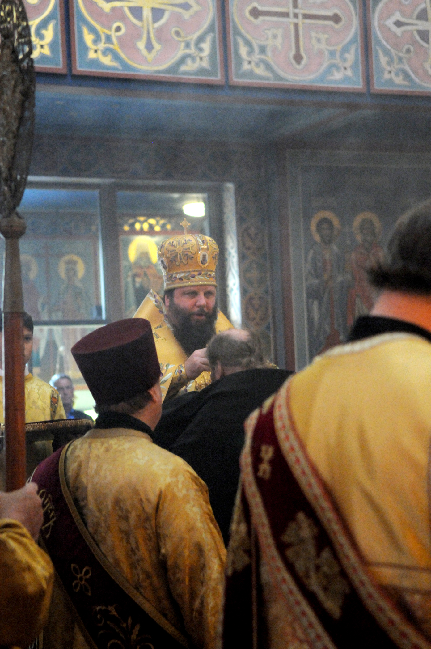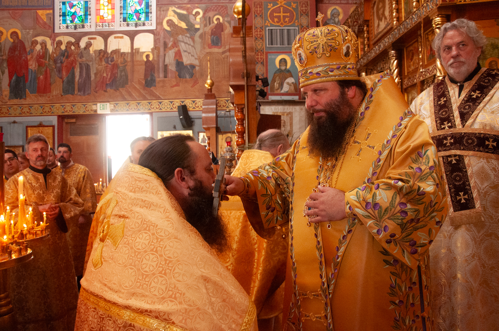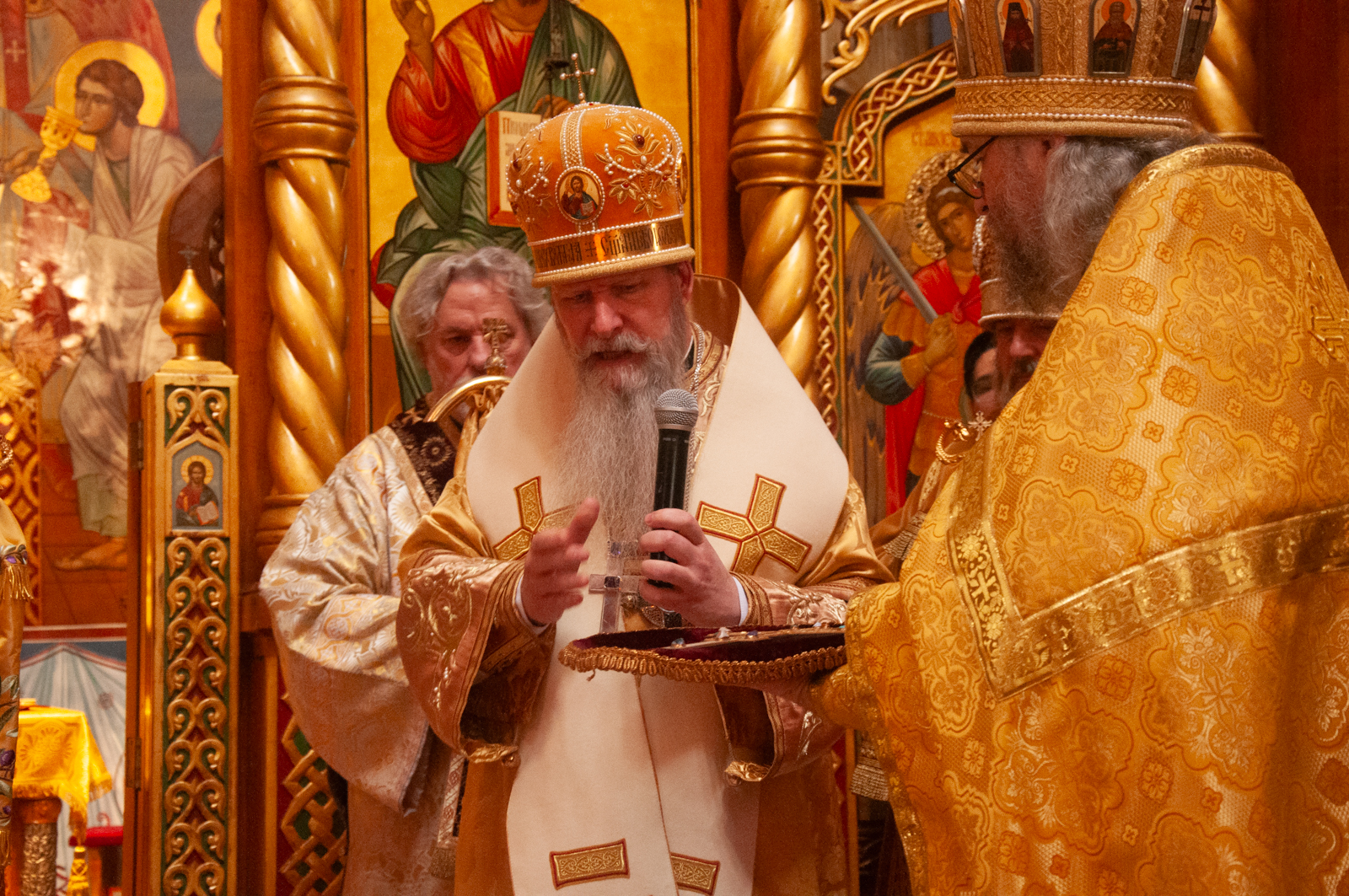 На малом входе Божественной литургии Первоиерарх Русской Зарубежной Церкви возложил золотой наперсный крест, Архиерейским Синодом выдаваемый, на иеромонаха Петра (Каракозова), клирика Западно-Американской епархии.