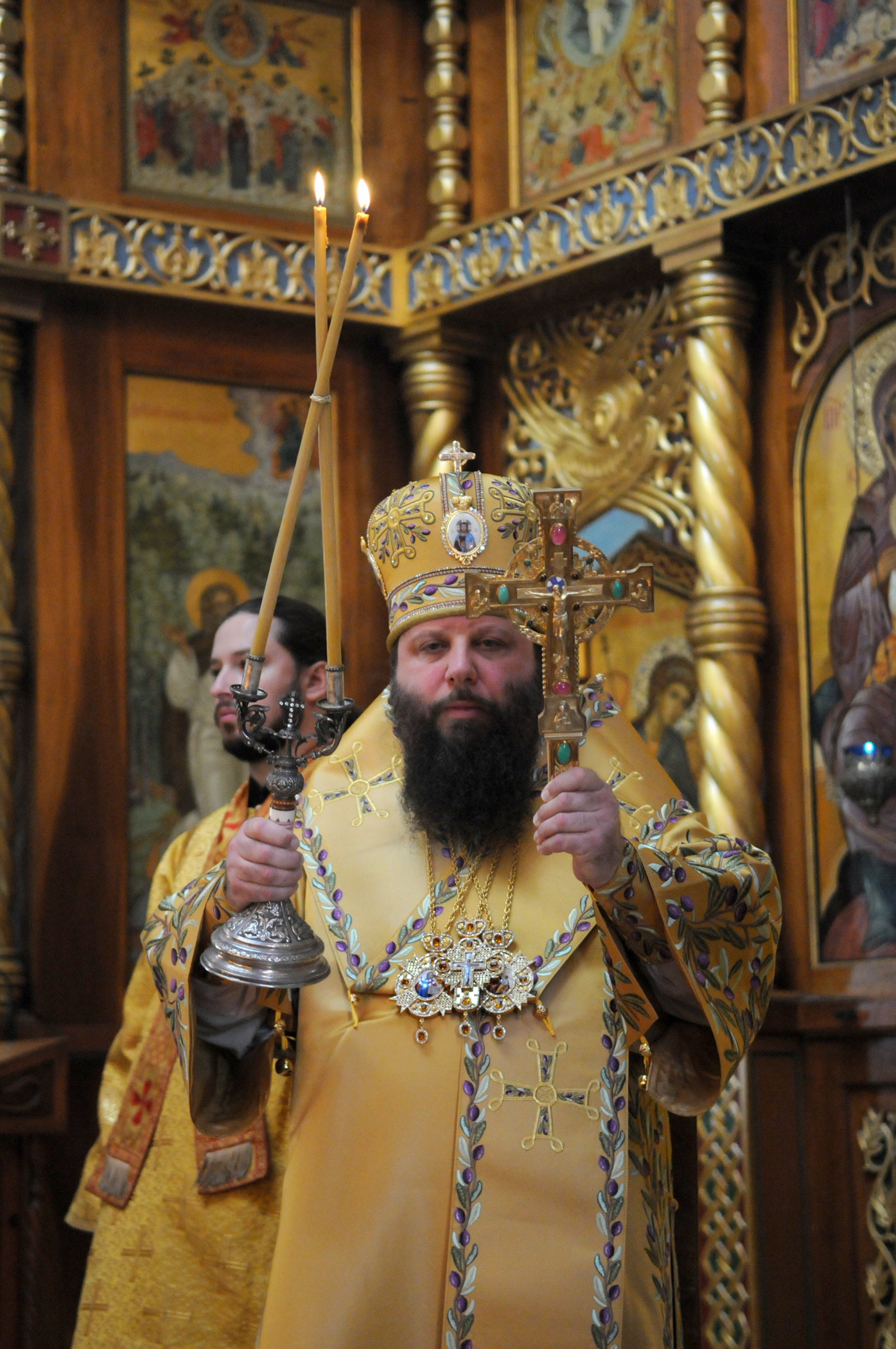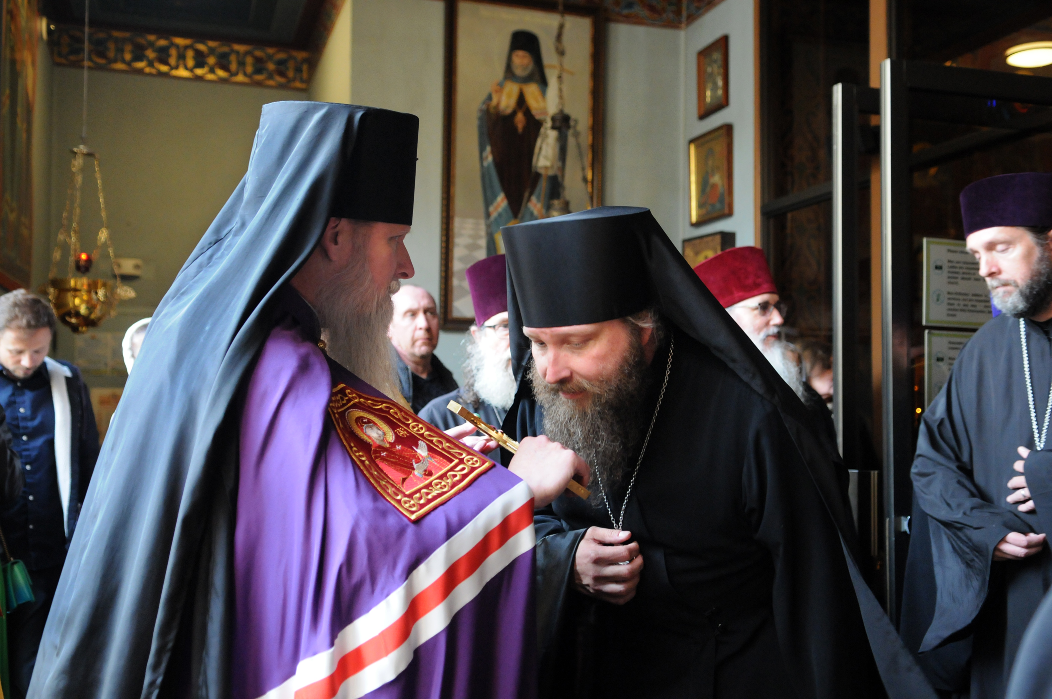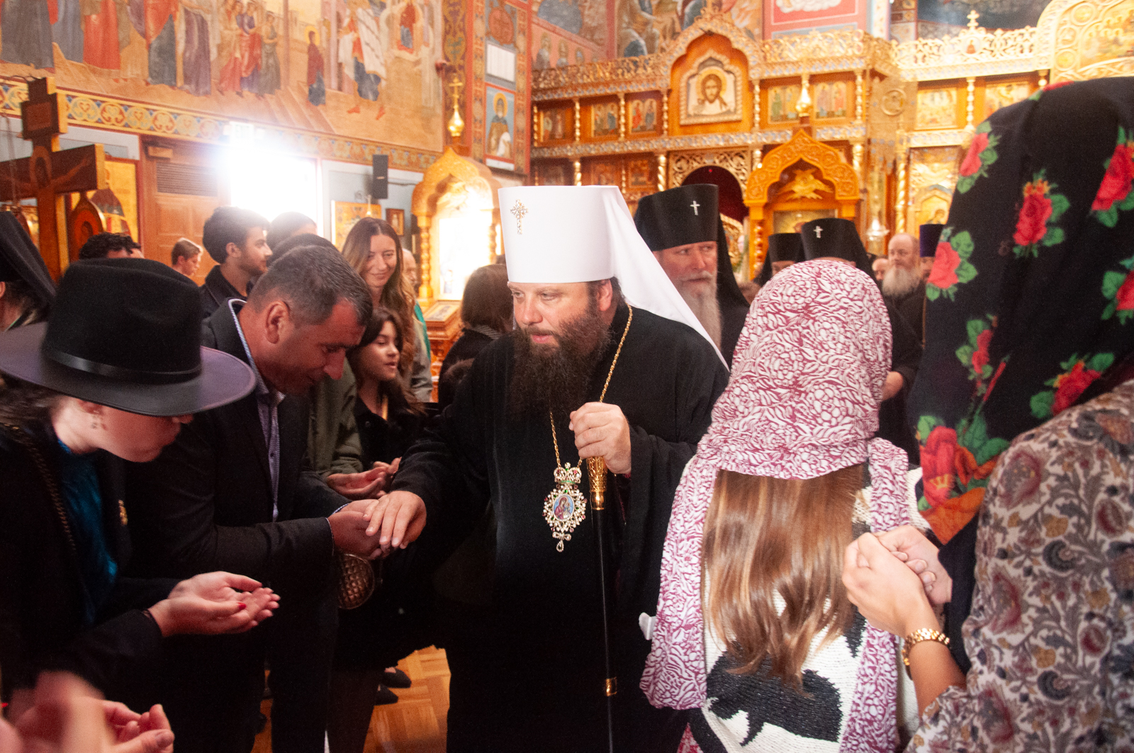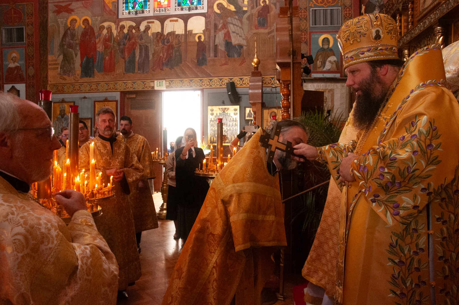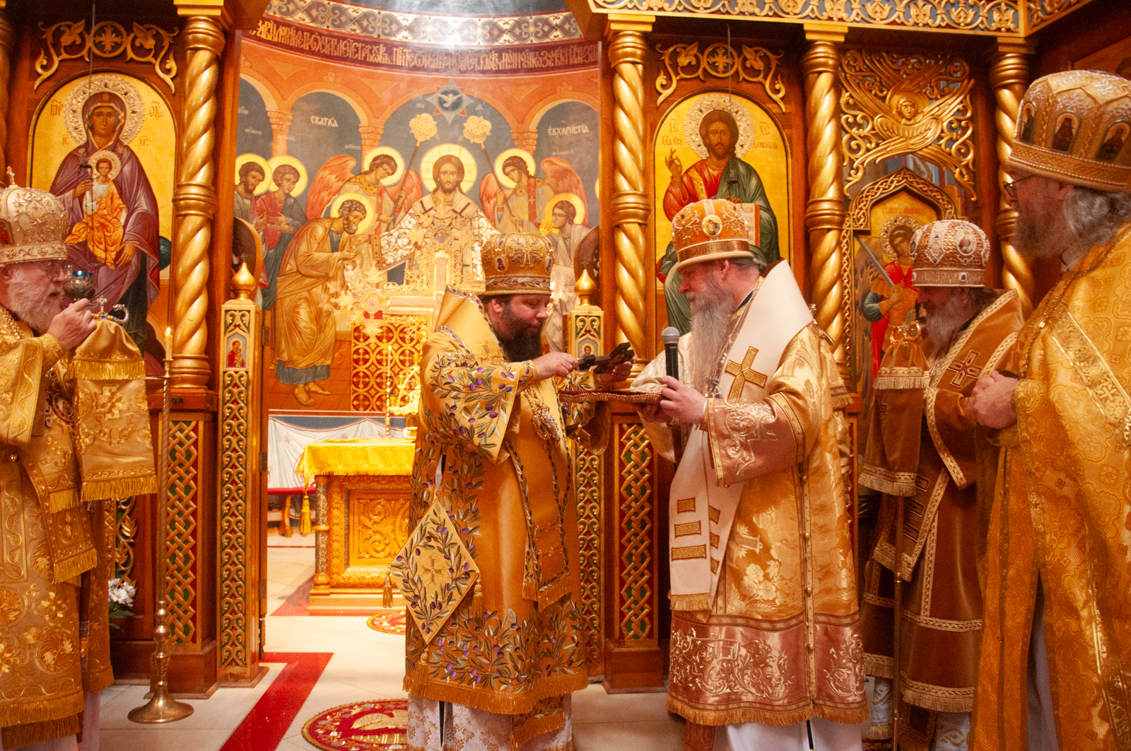 На малом входе Божественной литургии Первоиерарх Русской Зарубежной Церкви возложил золотой наперсный крест, Архиерейским Синодом выдаваемый, на иеромонаха Петра (Каракозова), клирика Западно-Американской епархии.