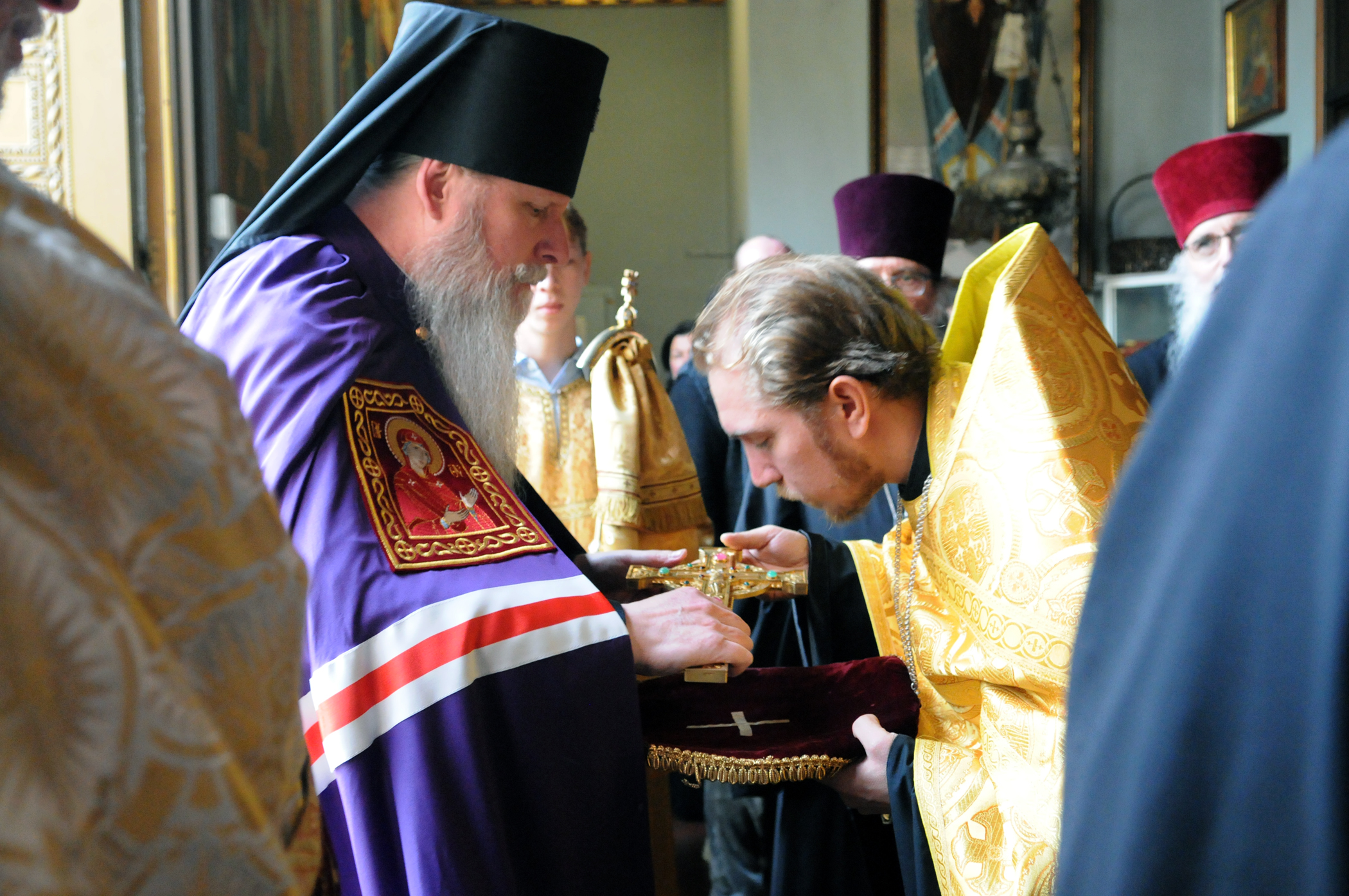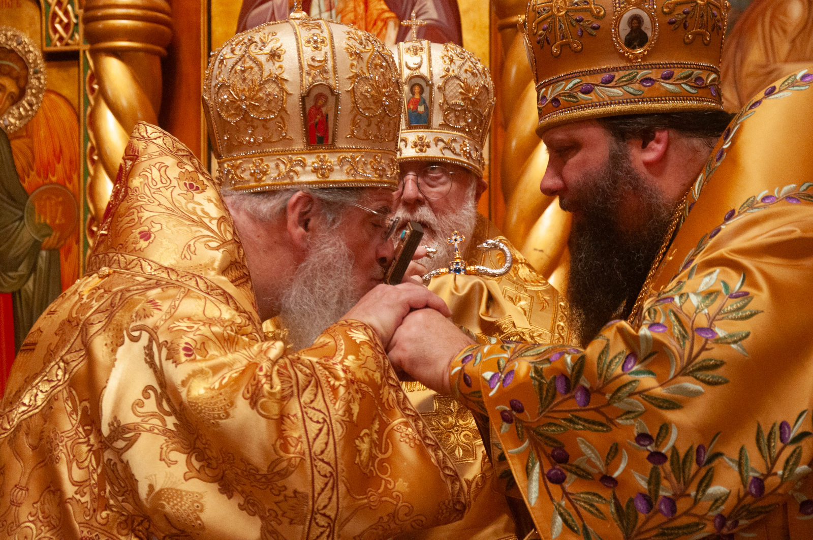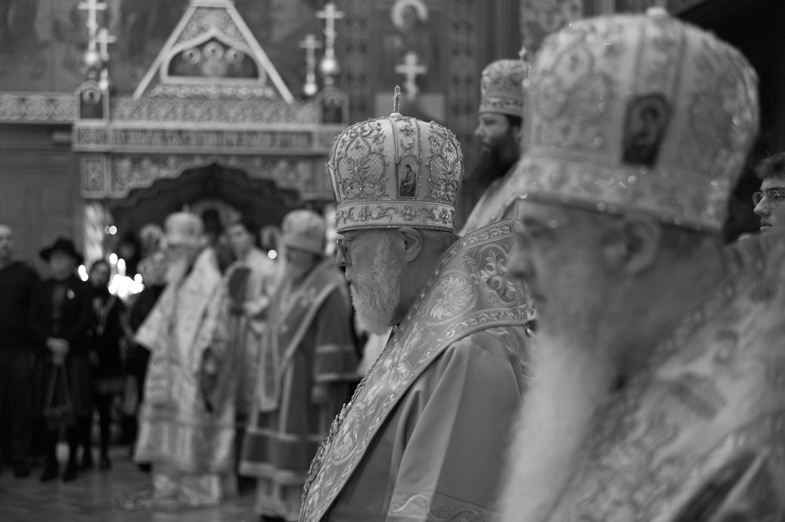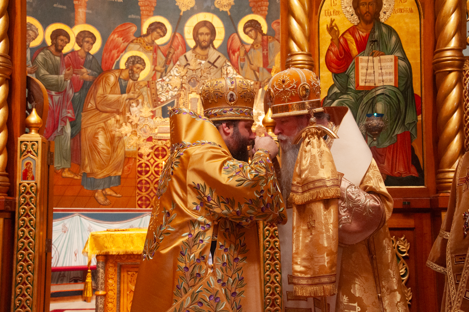 На малом входе Божественной литургии Первоиерарх Русской Зарубежной Церкви возложил золотой наперсный крест, Архиерейским Синодом выдаваемый, на иеромонаха Петра (Каракозова), клирика Западно-Американской епархии.
