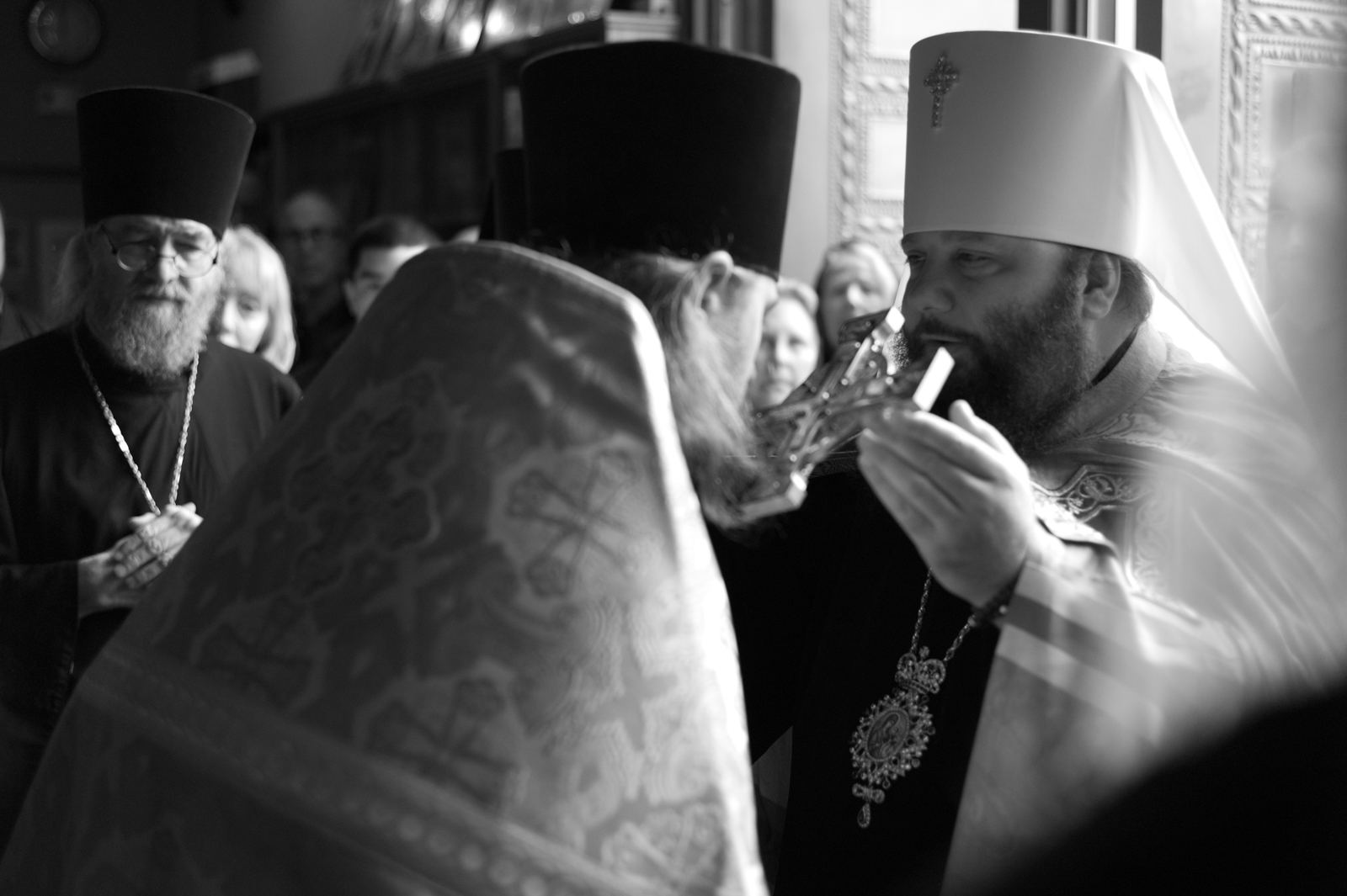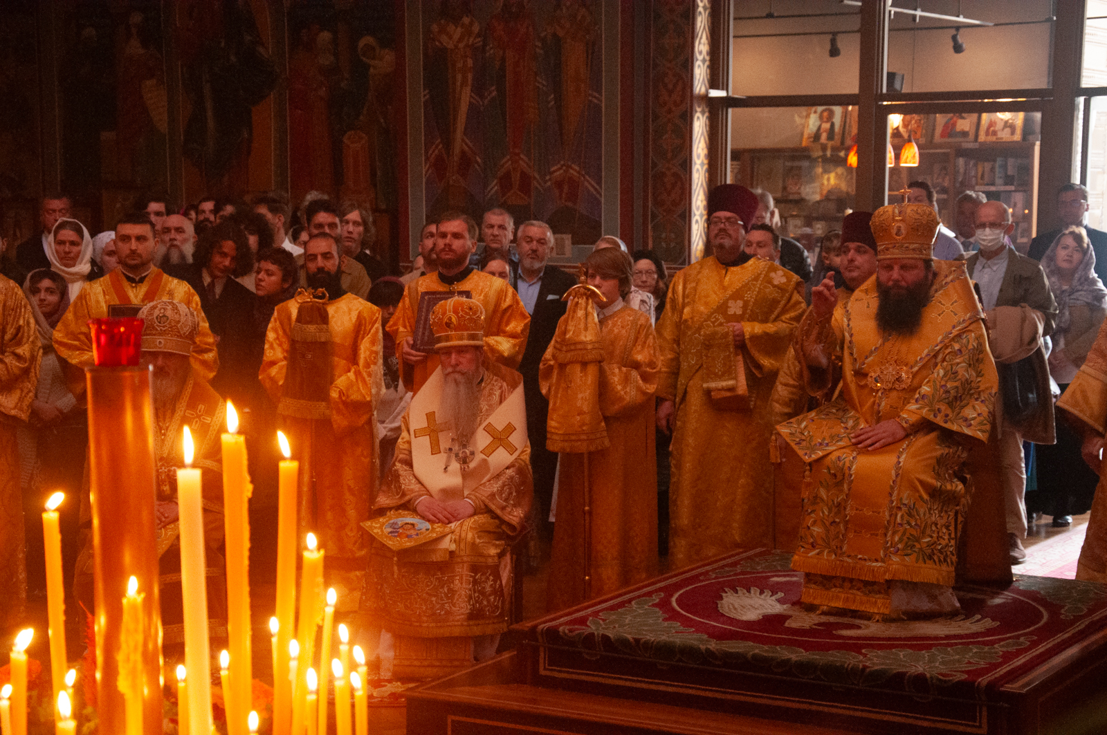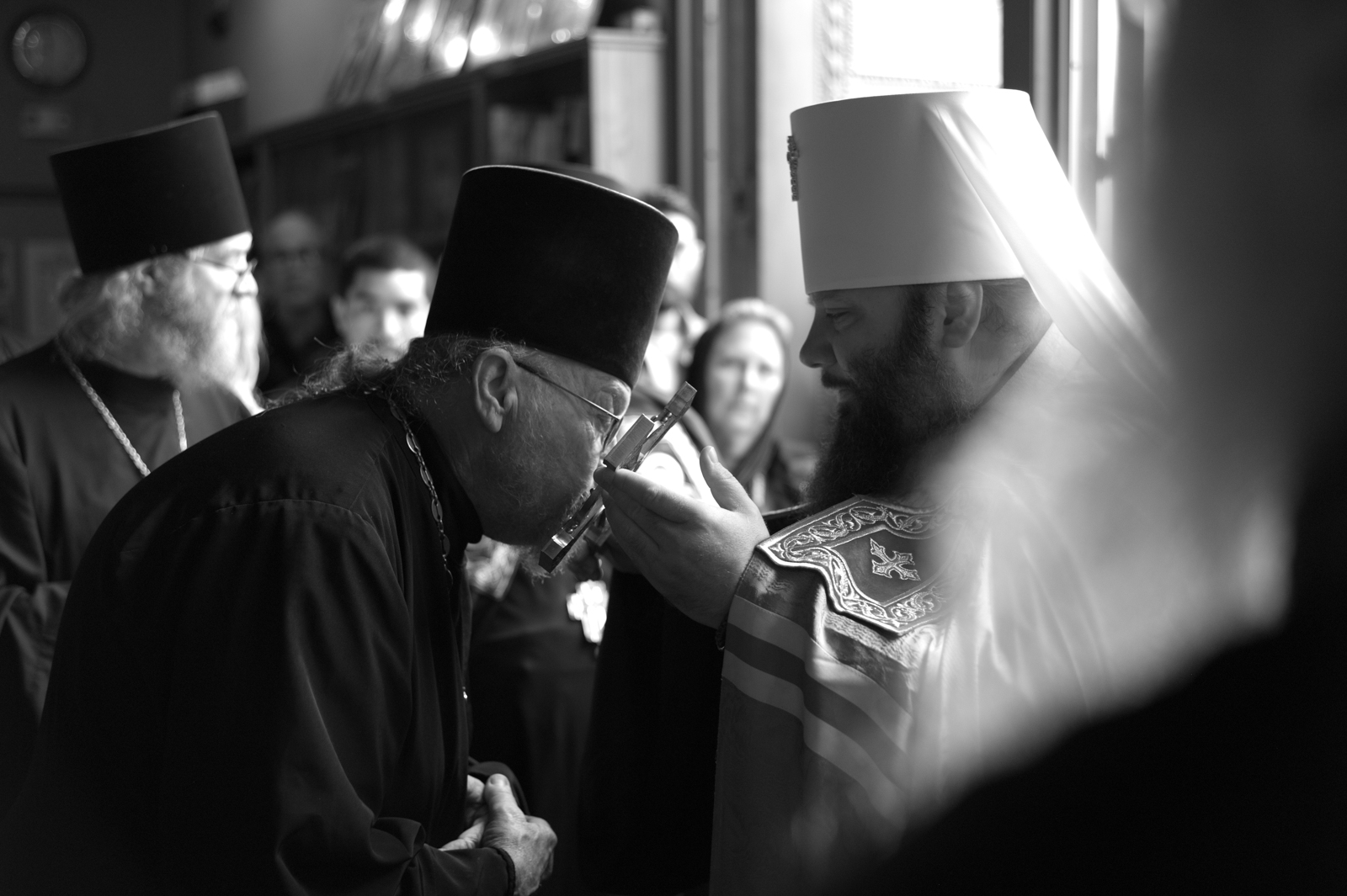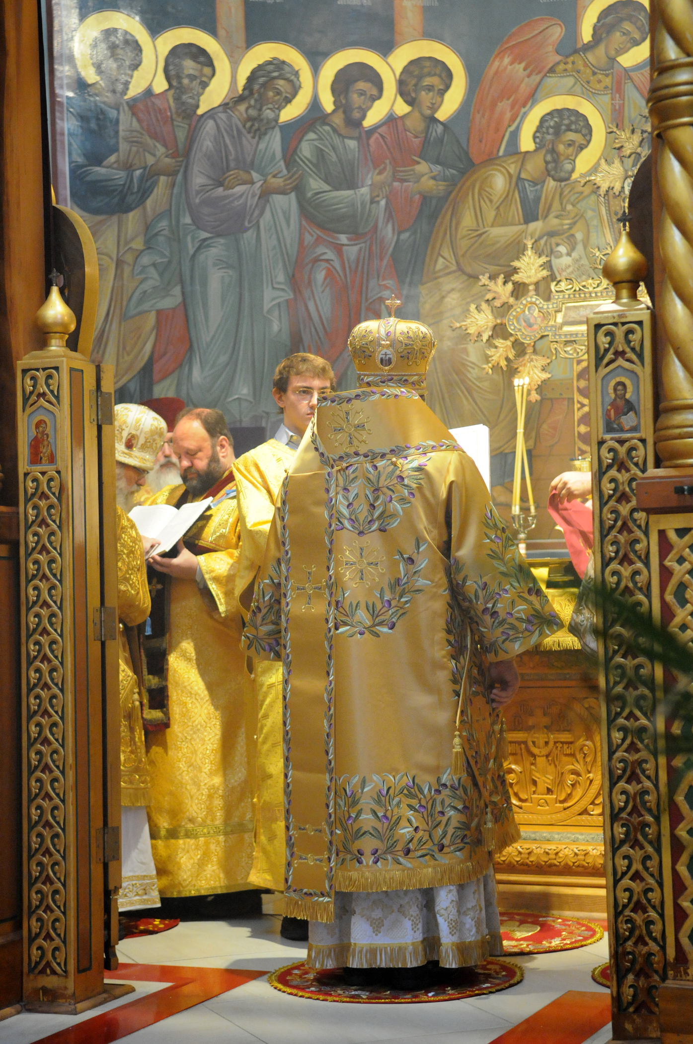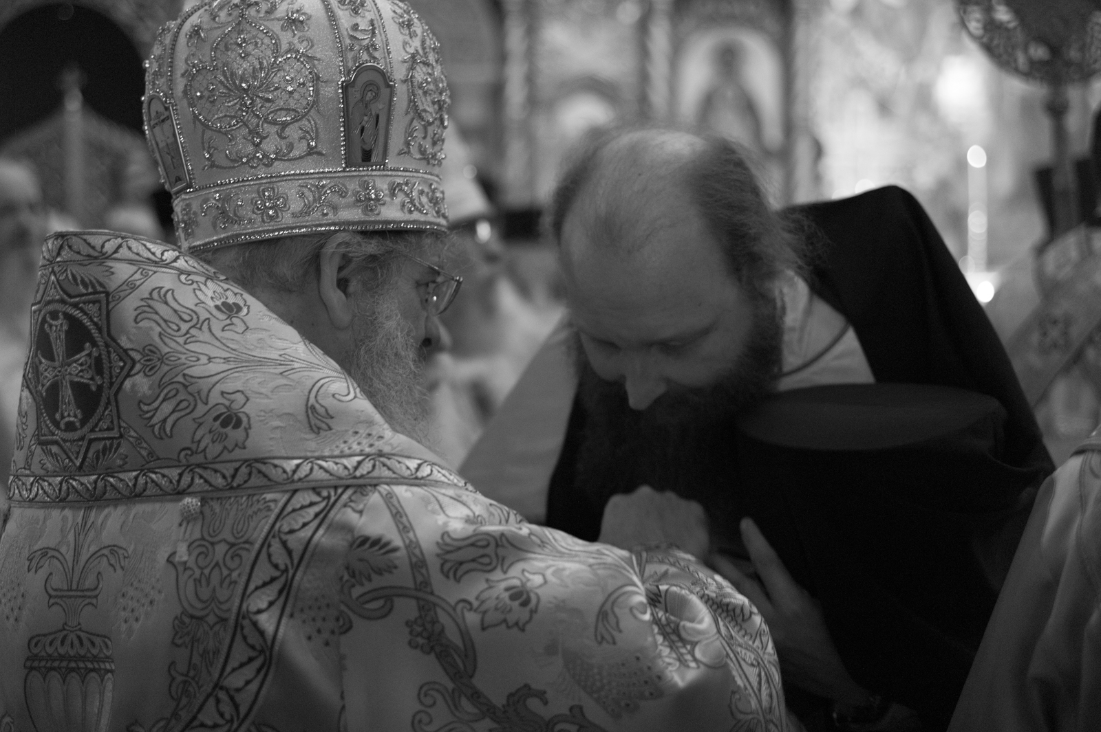 На малом входе Божественной литургии Первоиерарх Русской Зарубежной Церкви возложил золотой наперсный крест, Архиерейским Синодом выдаваемый, на иеромонаха Петра (Каракозова), клирика Западно-Американской епархии.