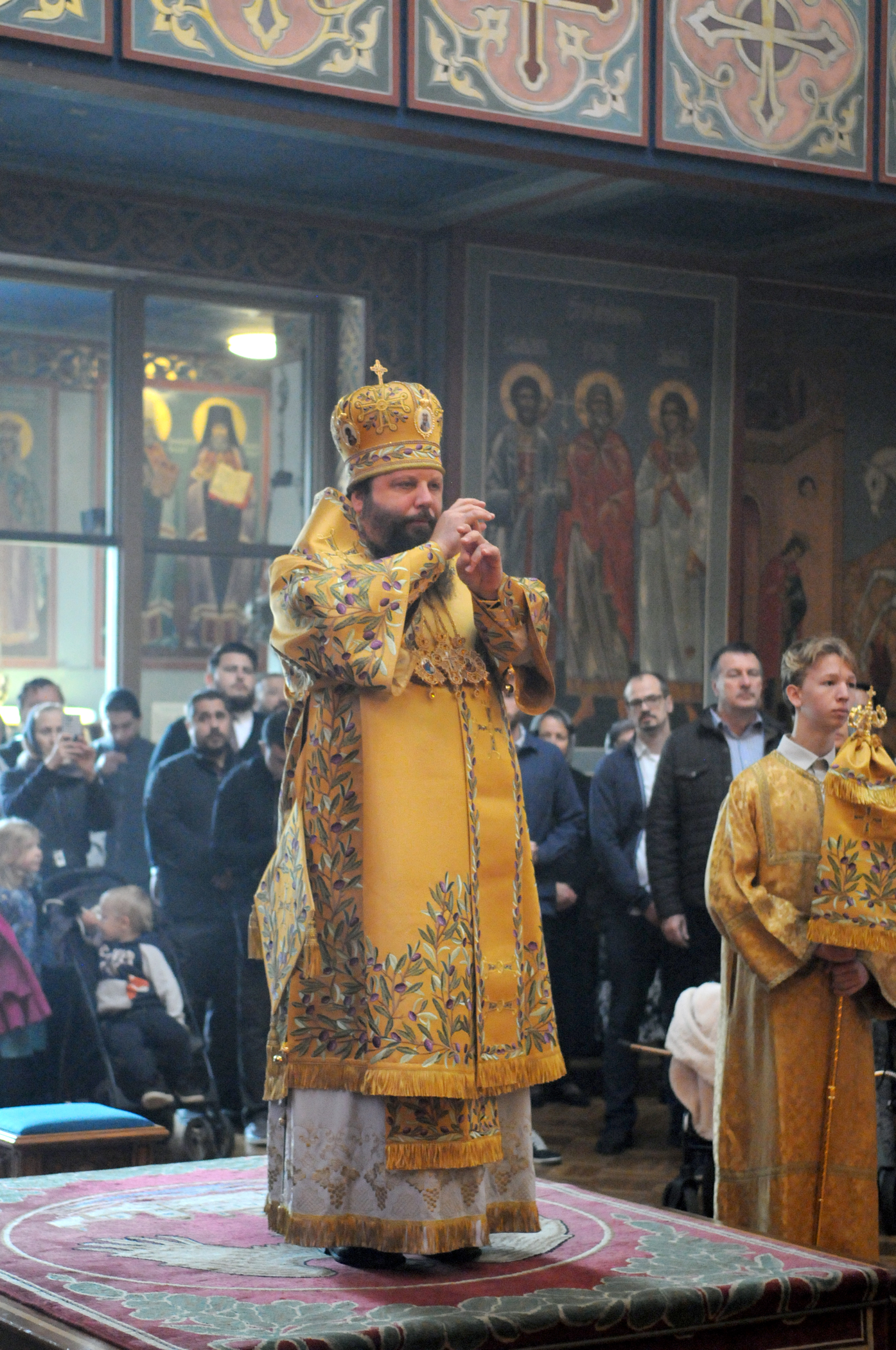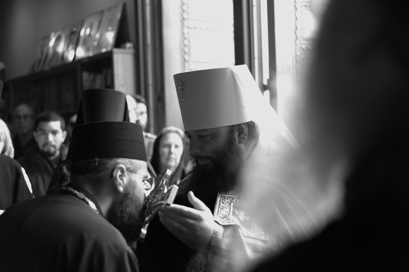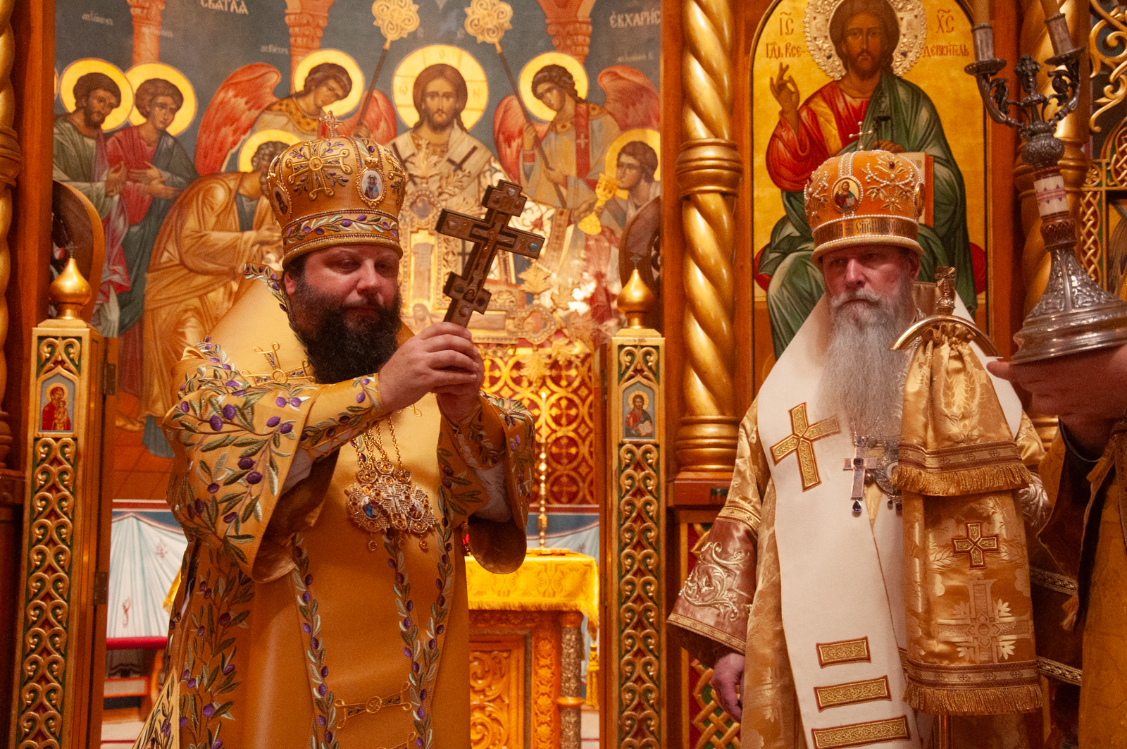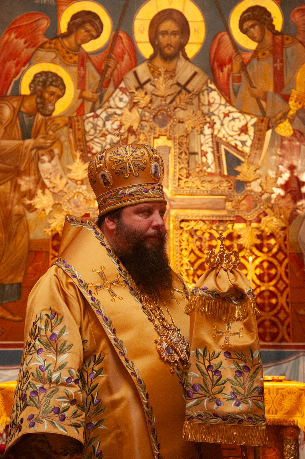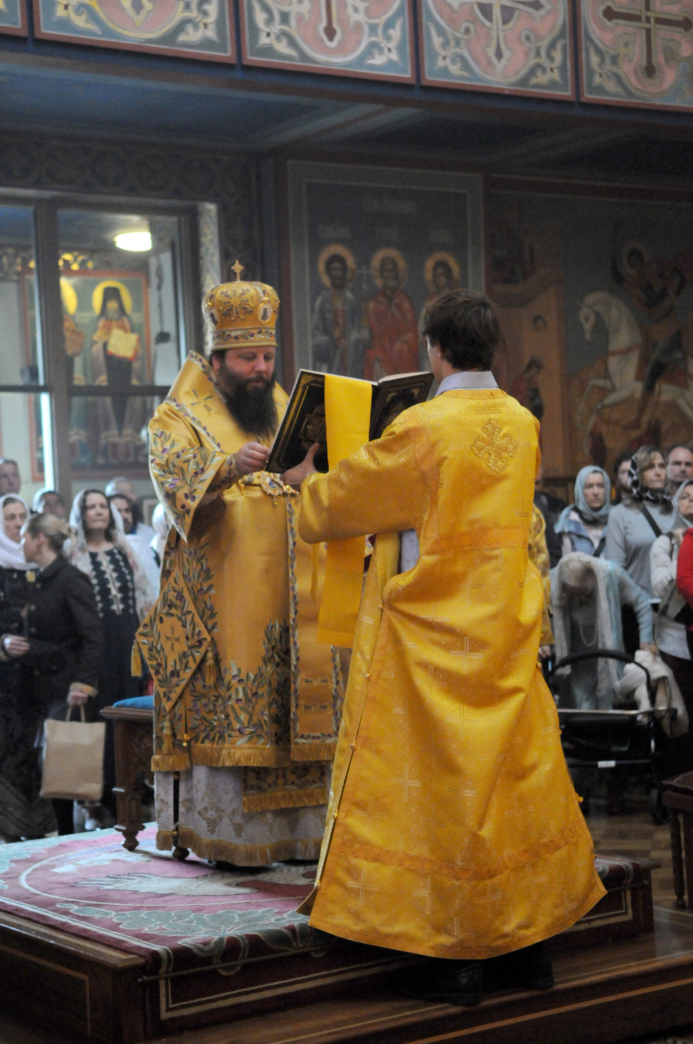 На малом входе Божественной литургии Первоиерарх Русской Зарубежной Церкви возложил золотой наперсный крест, Архиерейским Синодом выдаваемый, на иеромонаха Петра (Каракозова), клирика Западно-Американской епархии.