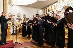 Синодальный хор под тактичным руководством регента Вадима С. Гана исполнил замечательную подборку литургических песнопений архиерейской Божественной литургии, включающую произведения классических композиторов, таких как Кастальский и Львовский, а также современных композиторов-эмигрантов, таких как Ледковский и Константинов.